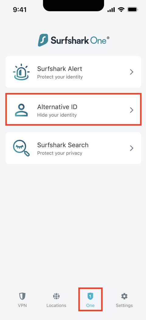 - Open the Surfshark application for Android or iOS, tap on the One tab, and then on Alternative ID.