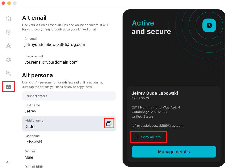 - Open the Surfshark app for macOS, go to the Alternative ID tab on the left, and click Copy all info on the right side of the window.