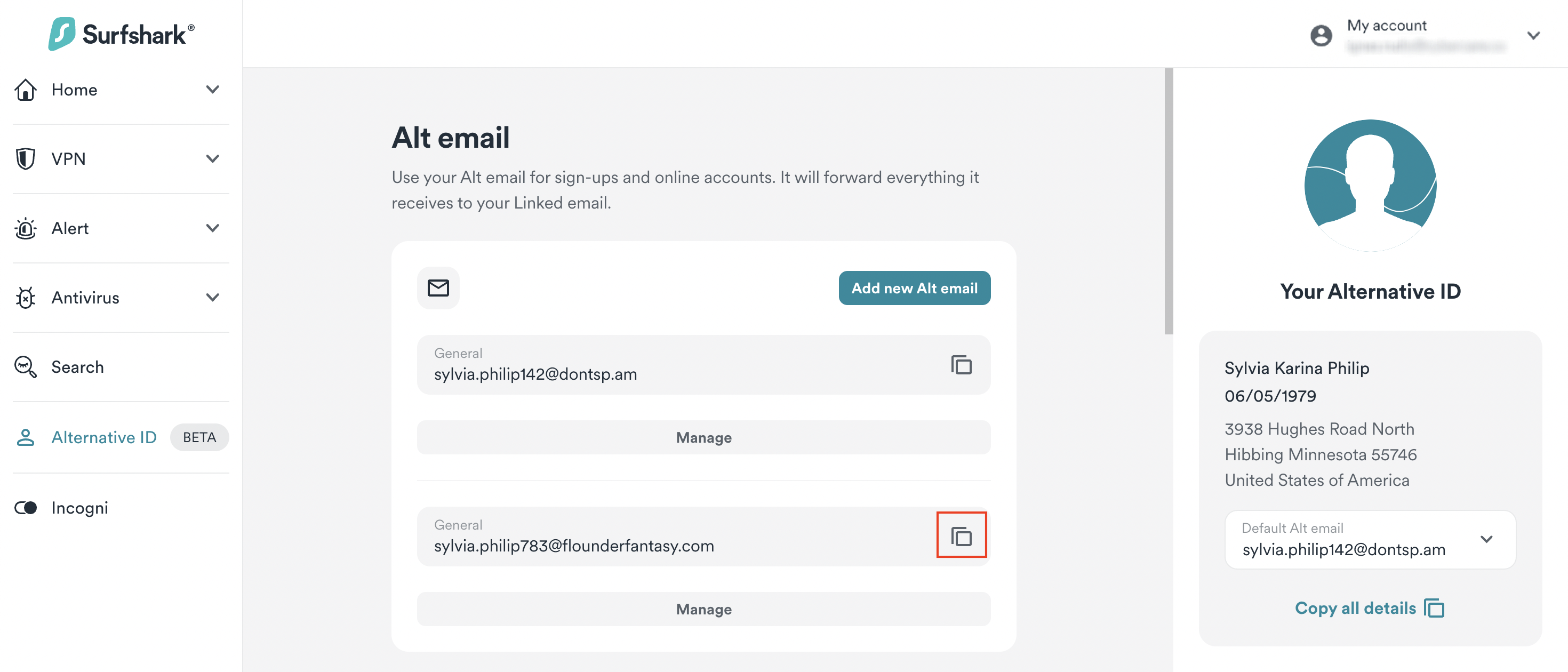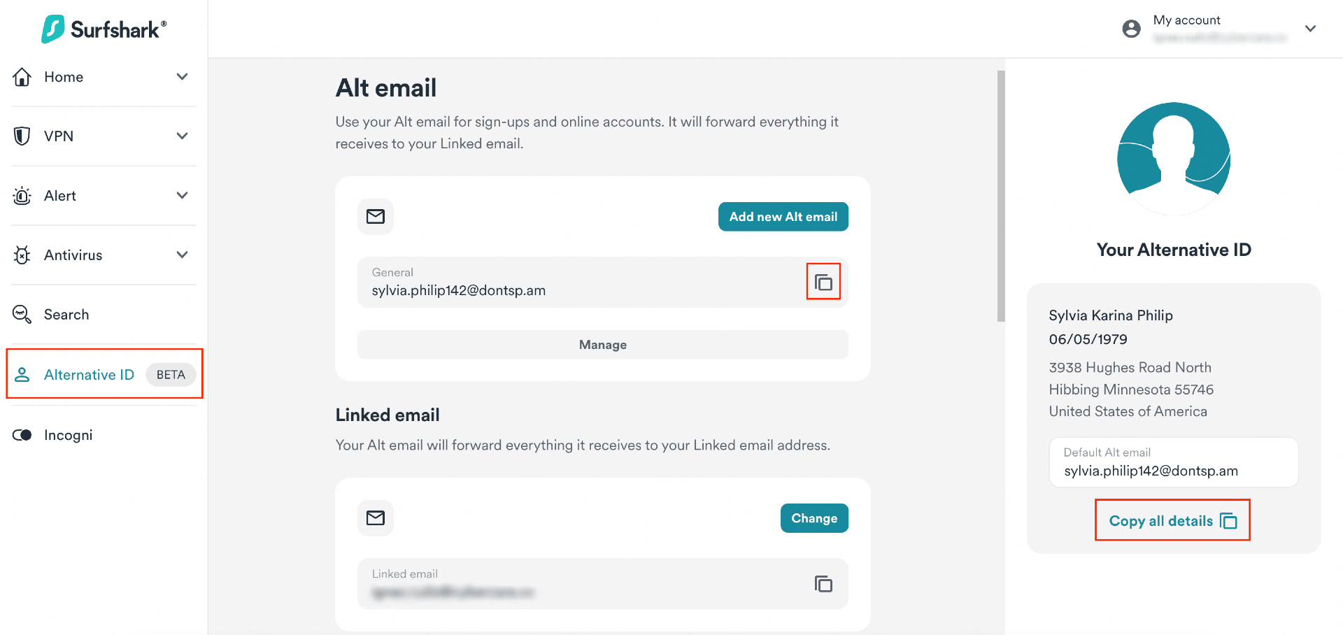 - Open the Surfshark browser extension, go to the Alternative ID tab, and click Copy all info on the right side of the window.