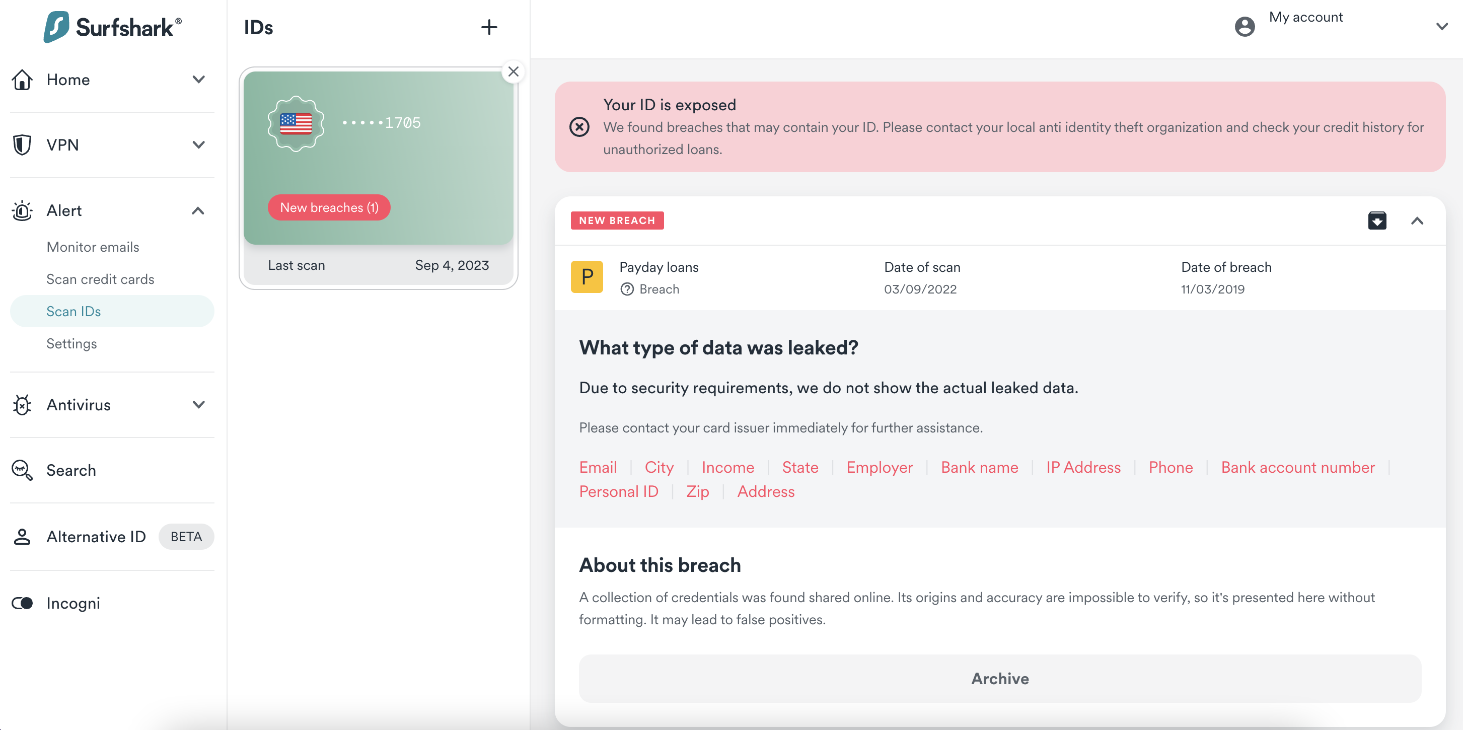 Surfshark Alert is a security tool that safeguards your sensitive data from the wrong hands. It keeps a watchful eye on your credentials for potential breaches and notifies you in case of any breach. You can view the details of the breach and take the necessary steps to secure your information through your Alert account.