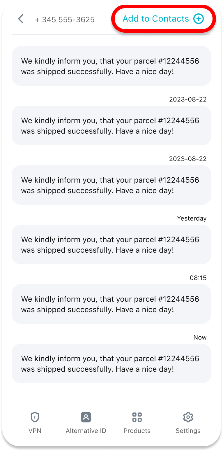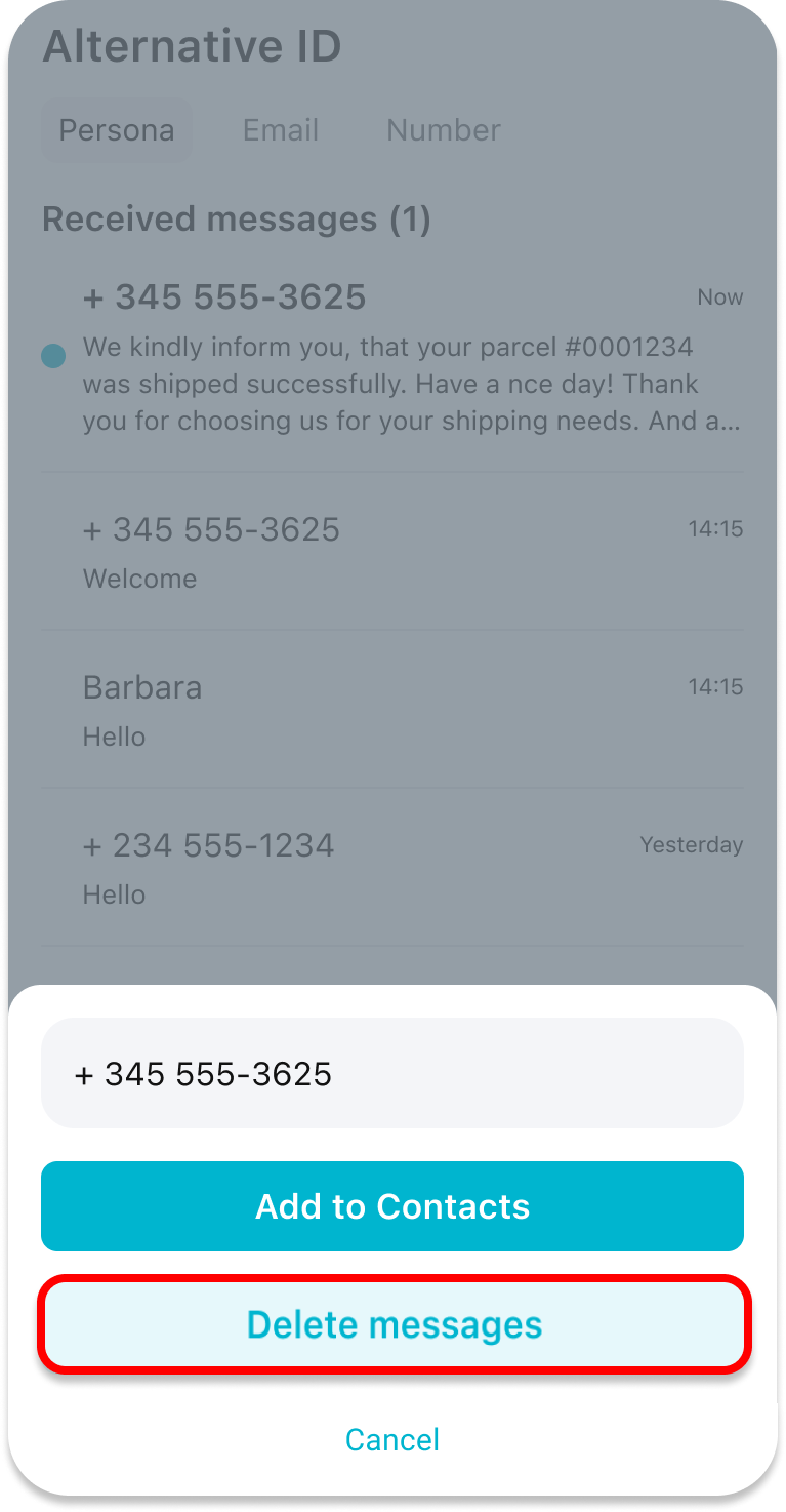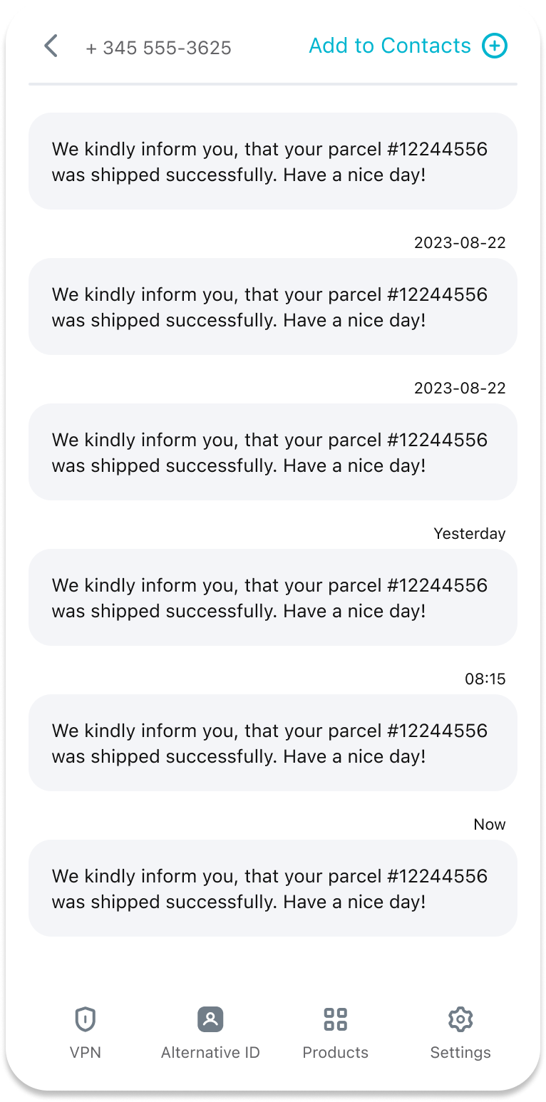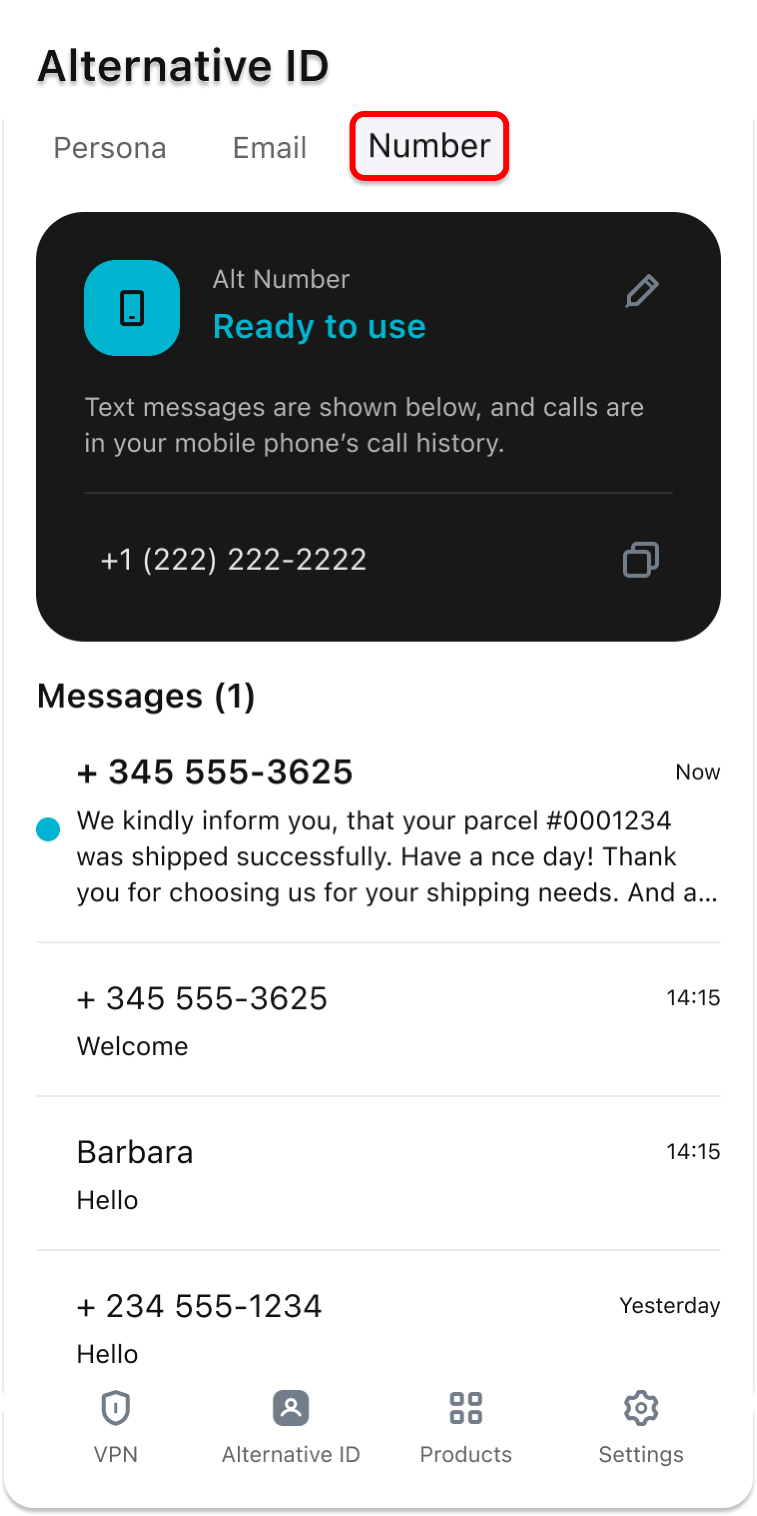 1. Open the Surfshark app on your mobile device, enter the Alternative ID tab, and tap on Number at the top. Here, you will find any text messages sent to your Alternative Number.