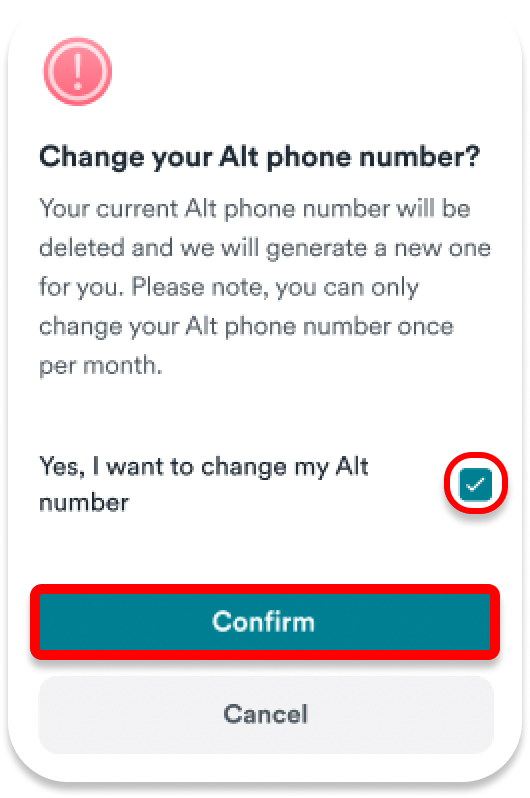 2. Changing your Alternative Number deletes your old one, meaning that you will no longer be able to receive any messages to it. To proceed, tick the box in the pop-up and press Confirm.