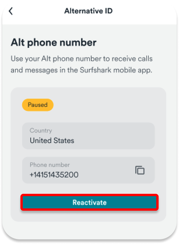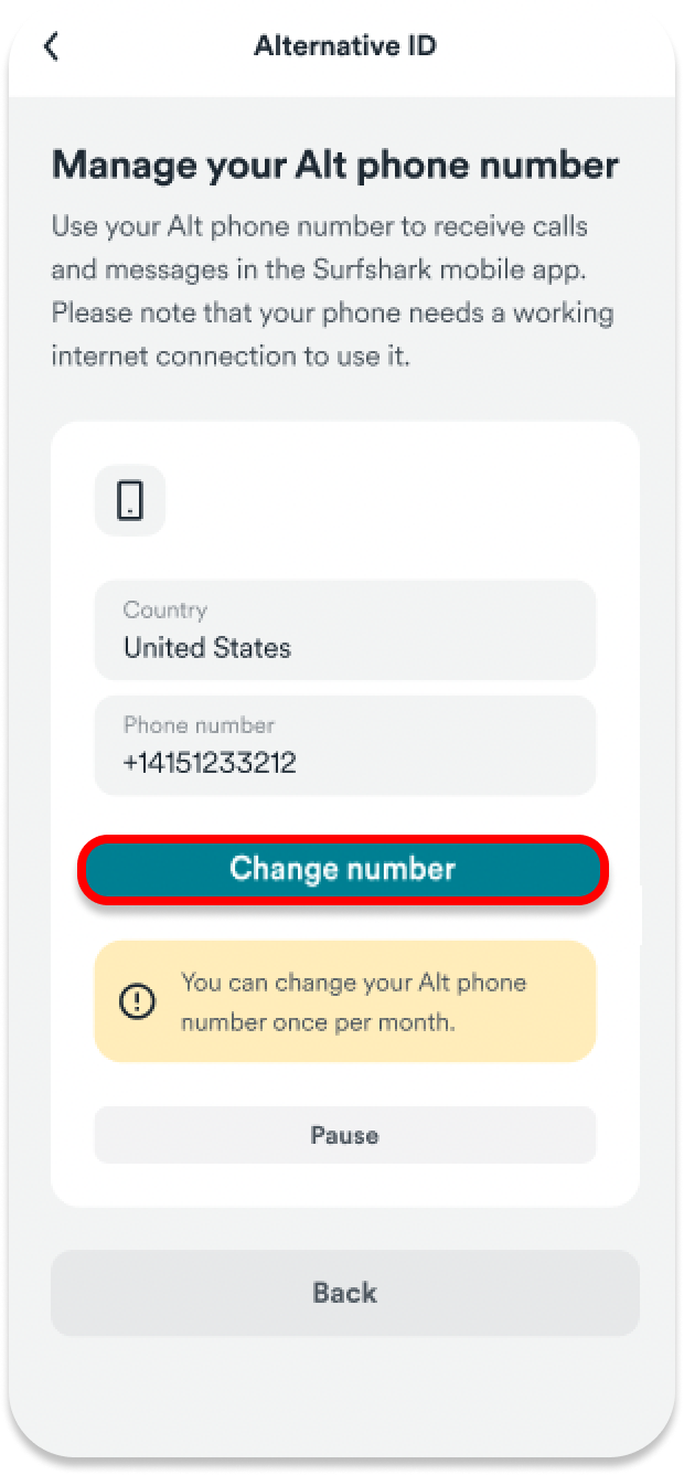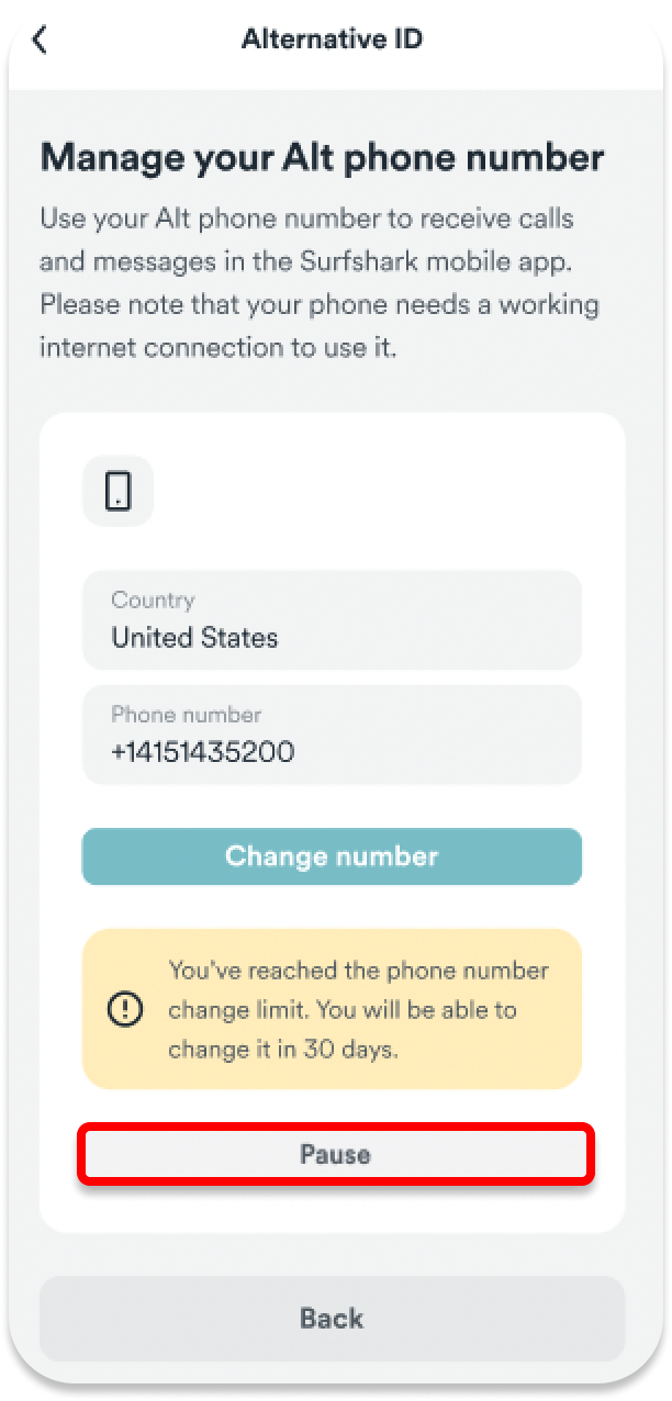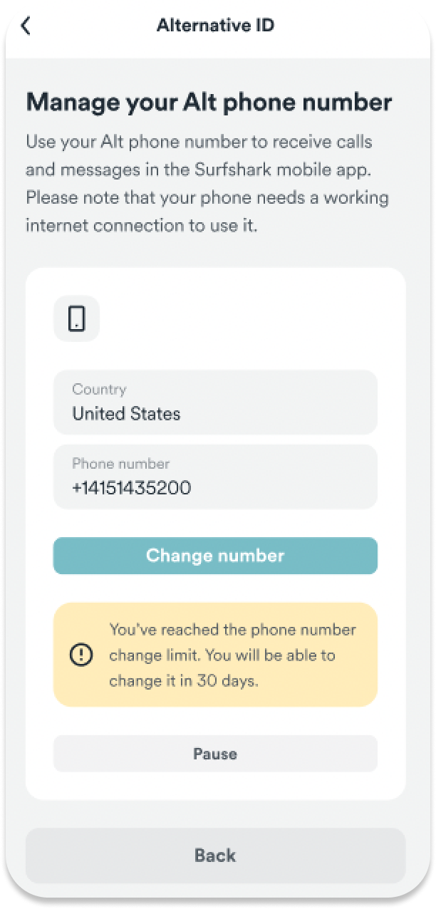 1. Enter Surfshark's dashboard and tap on Alternative ID. Here, you will find the options to Pause or Change your Alternative Number.