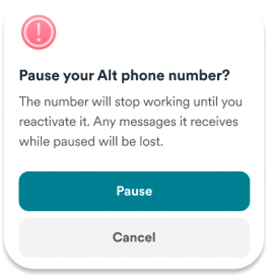 5. Once you Pause your Alternative Number, you will not be able to receive any messages and they will be unrecoverable. To proceed, press Pause on the pop-up.