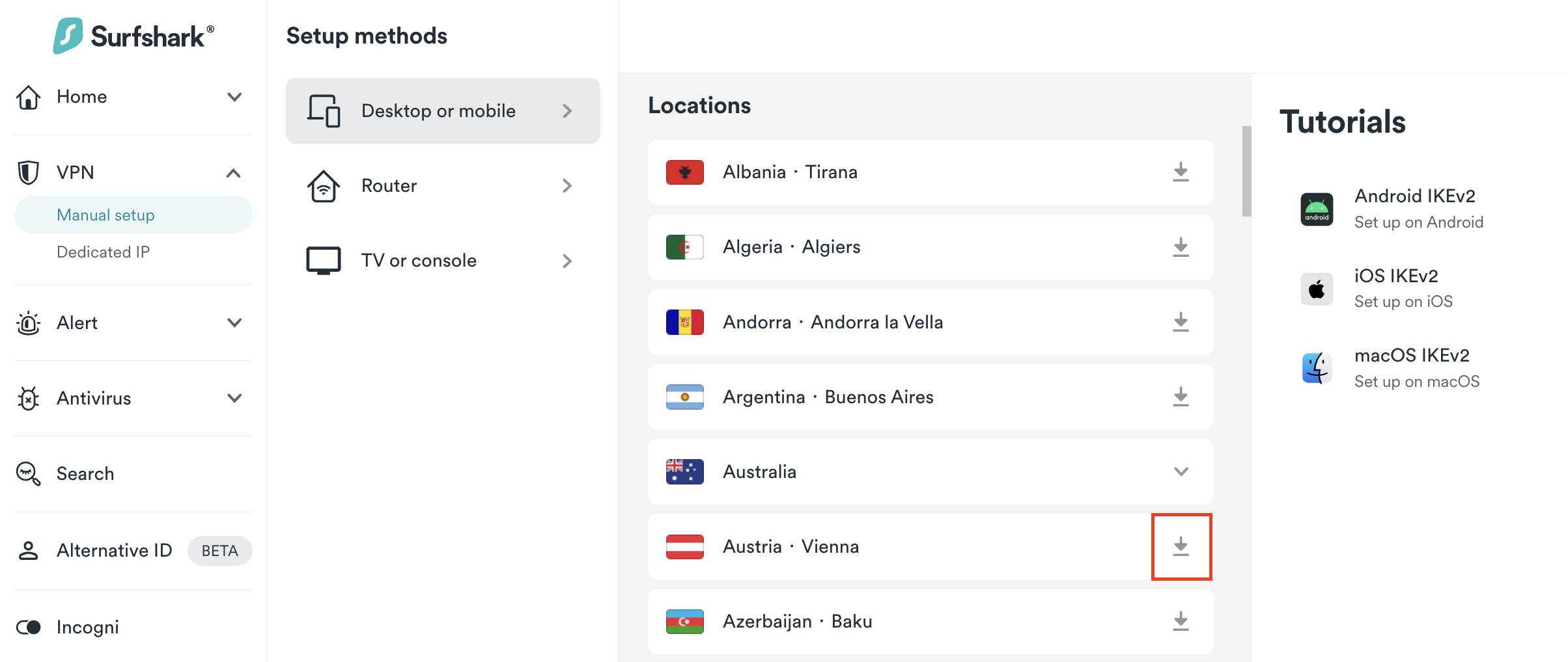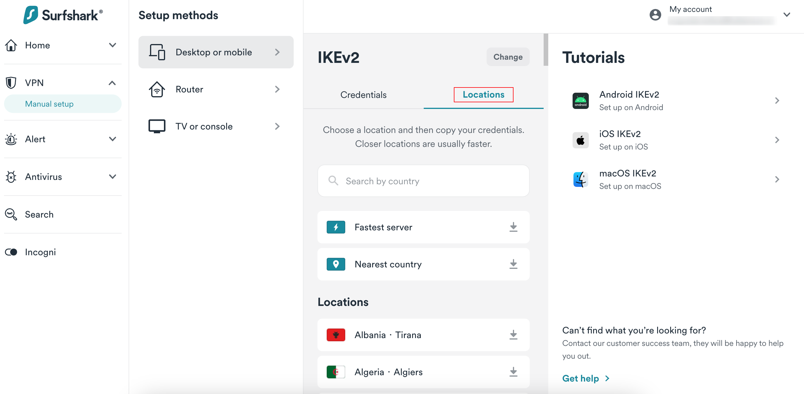 1. Enter the Surfshark login page and log in. Then, click on VPN > Manual Setup > Desktop or mobile > IKEv2 to navigate to the Credentials tab.