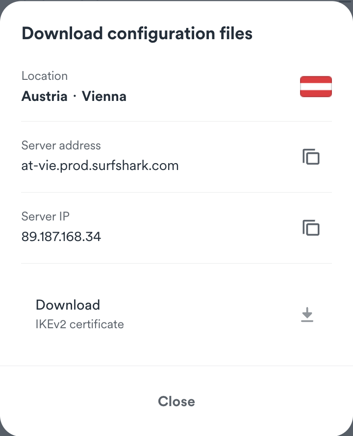 4. Here, you will find the server IP, server address, and the ability to download the IKEv2 certificate.