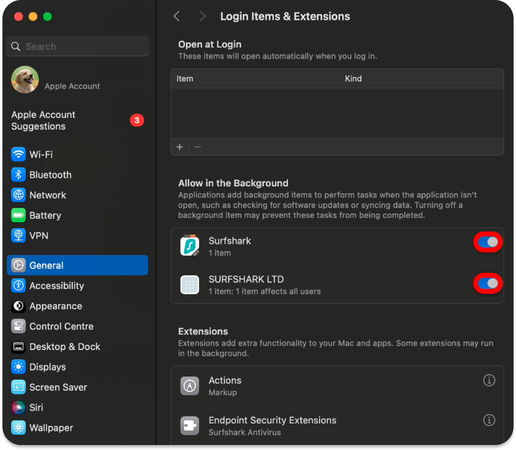 - Optionally, you can also enable Surfshark and SURFSHARK LTD to allow background processes by putting the toggle switch in the ON position.
