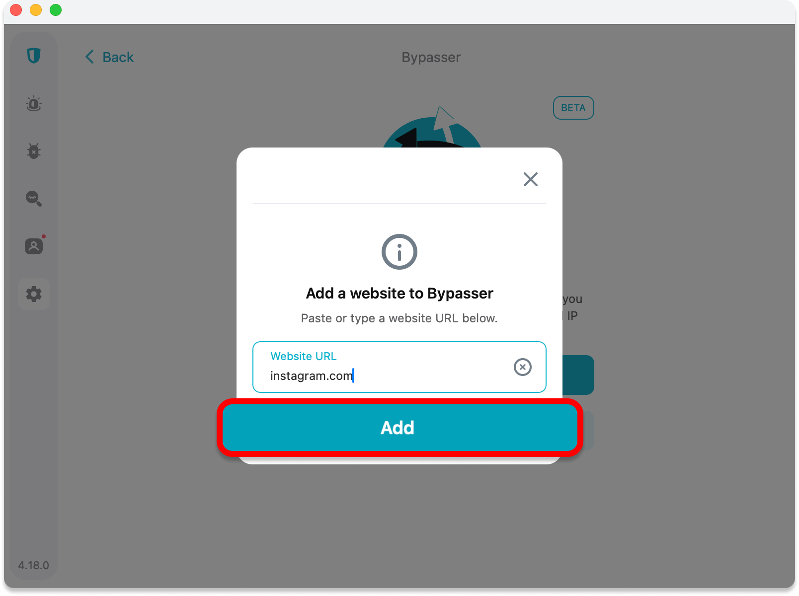 2. A window will appear with a field where you can input the website's URL. Once you're done, click Add.