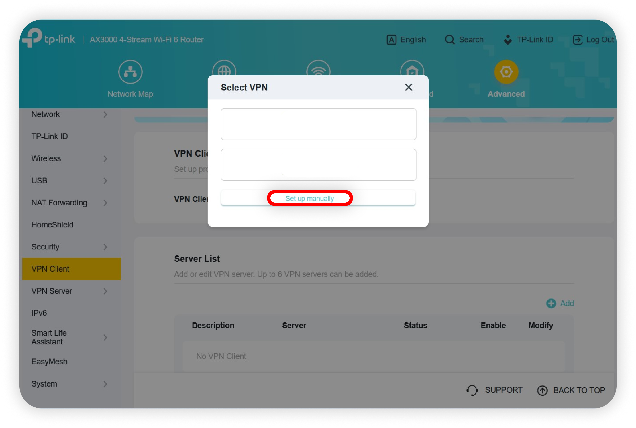 Before setting up the router, you will need to obtain the credentials for the manual setup and select a server to connect to.