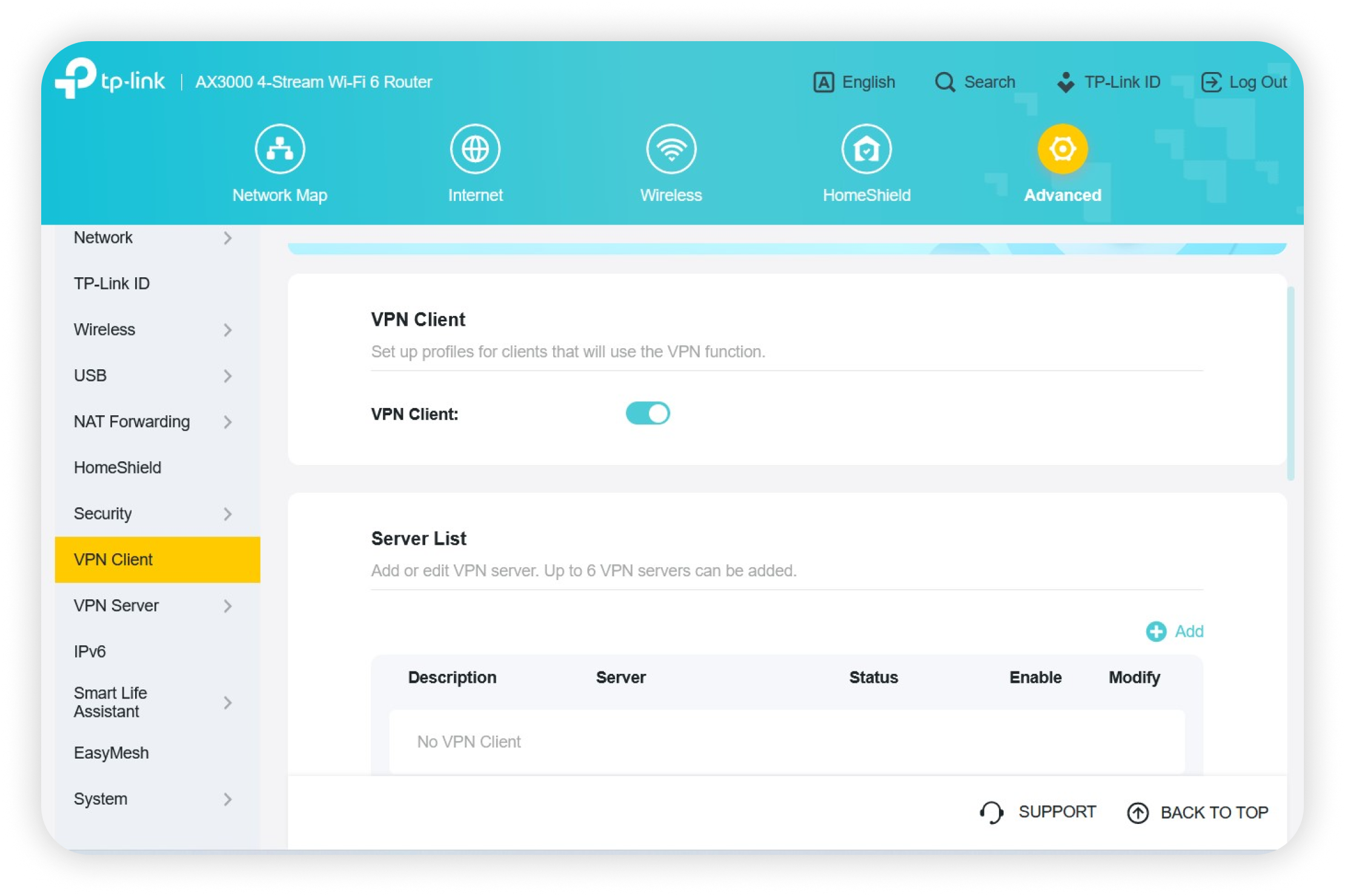 Turn to advance, select VPN Client, and enable the option VPN Client: