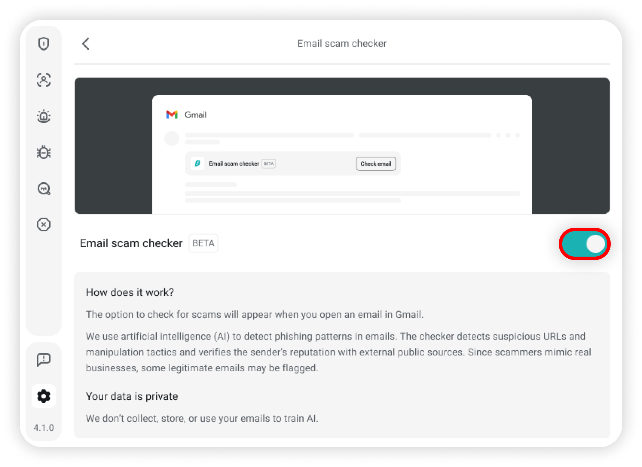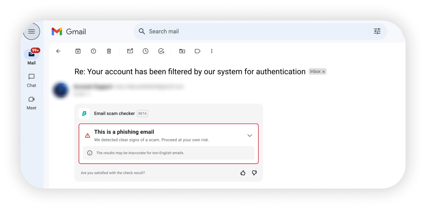 Since scammers mimic real businesses, some legitimate emails may be flagged. Keep in mind that we don’t collect or use your emails to train AI, and your data is only kept as long as needed for the scan before being deleted.
