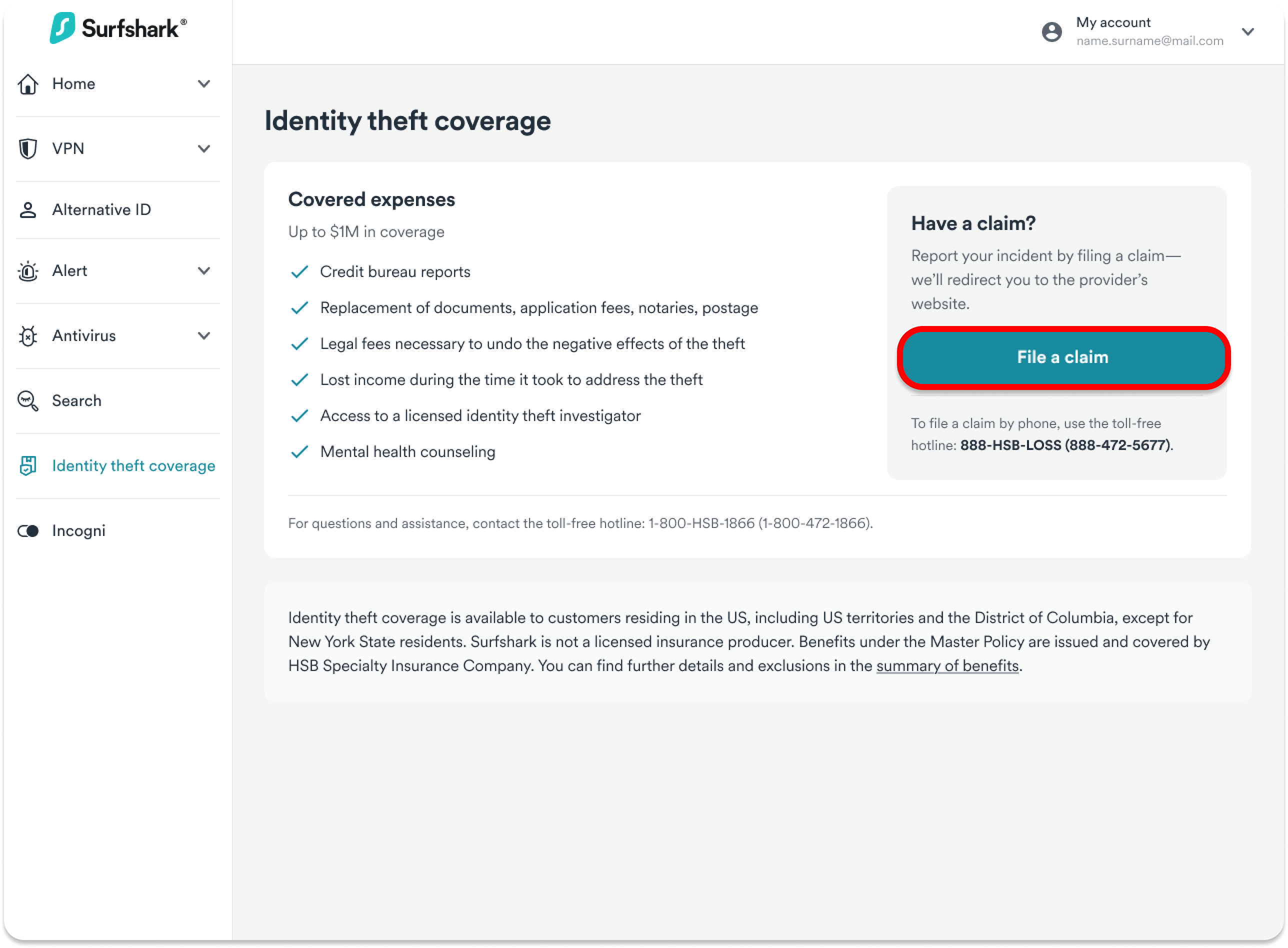 • Navigating to your Surfshark account Identity theft coverage section, and clicking on File a claim.