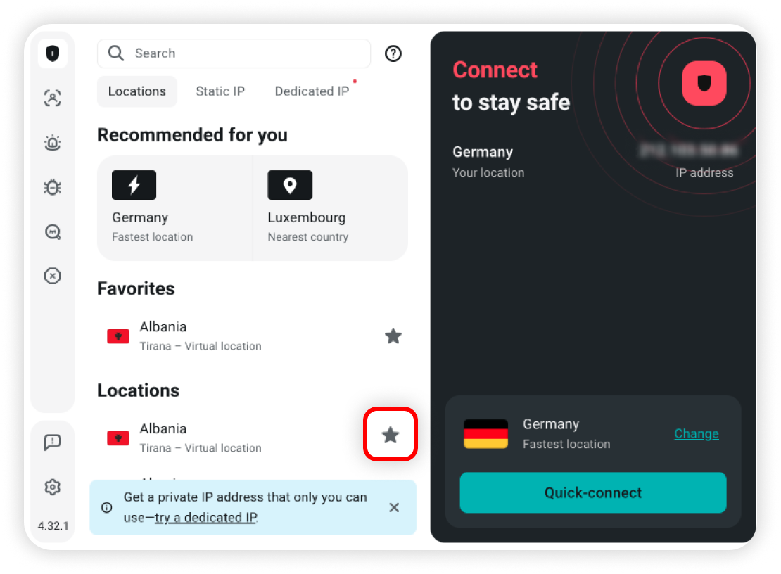 Configure which country you connect to when you press Quick-connect: