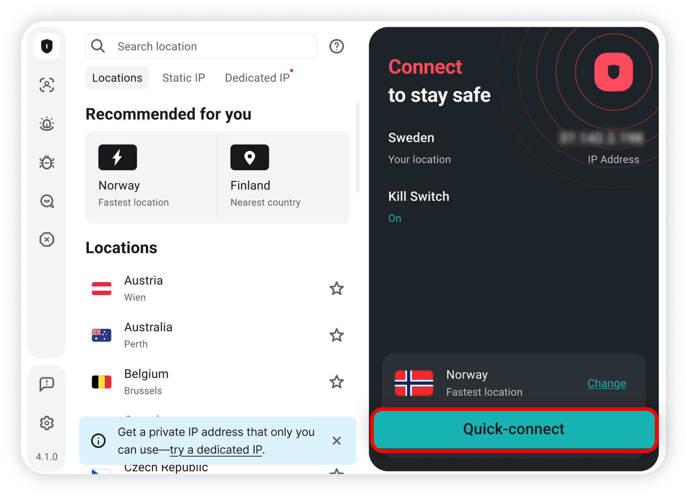 Quick-connect. Click the Quick-connect button. This will automatically connect you to the best-performing server: