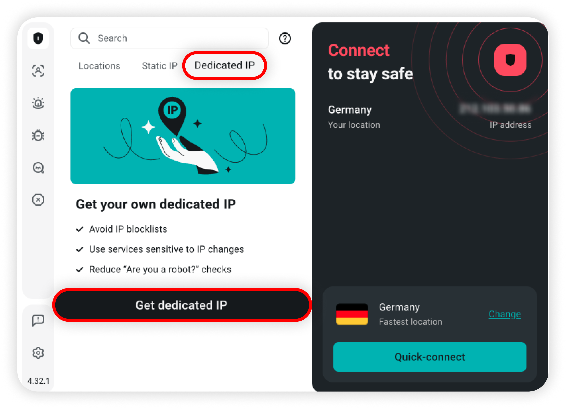 Alternatively, you can navigate to the Dedicated IP tab and connect to the Dedicated IP from there: