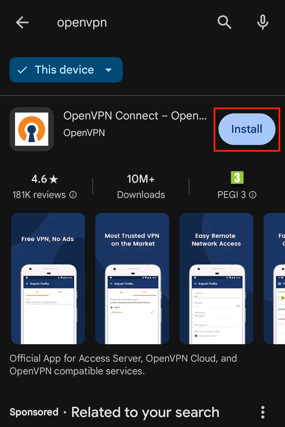 If you don't have access to the Google Play Store on your device, or can not find the OpenVPN app there, download the .apk version of this app from here.