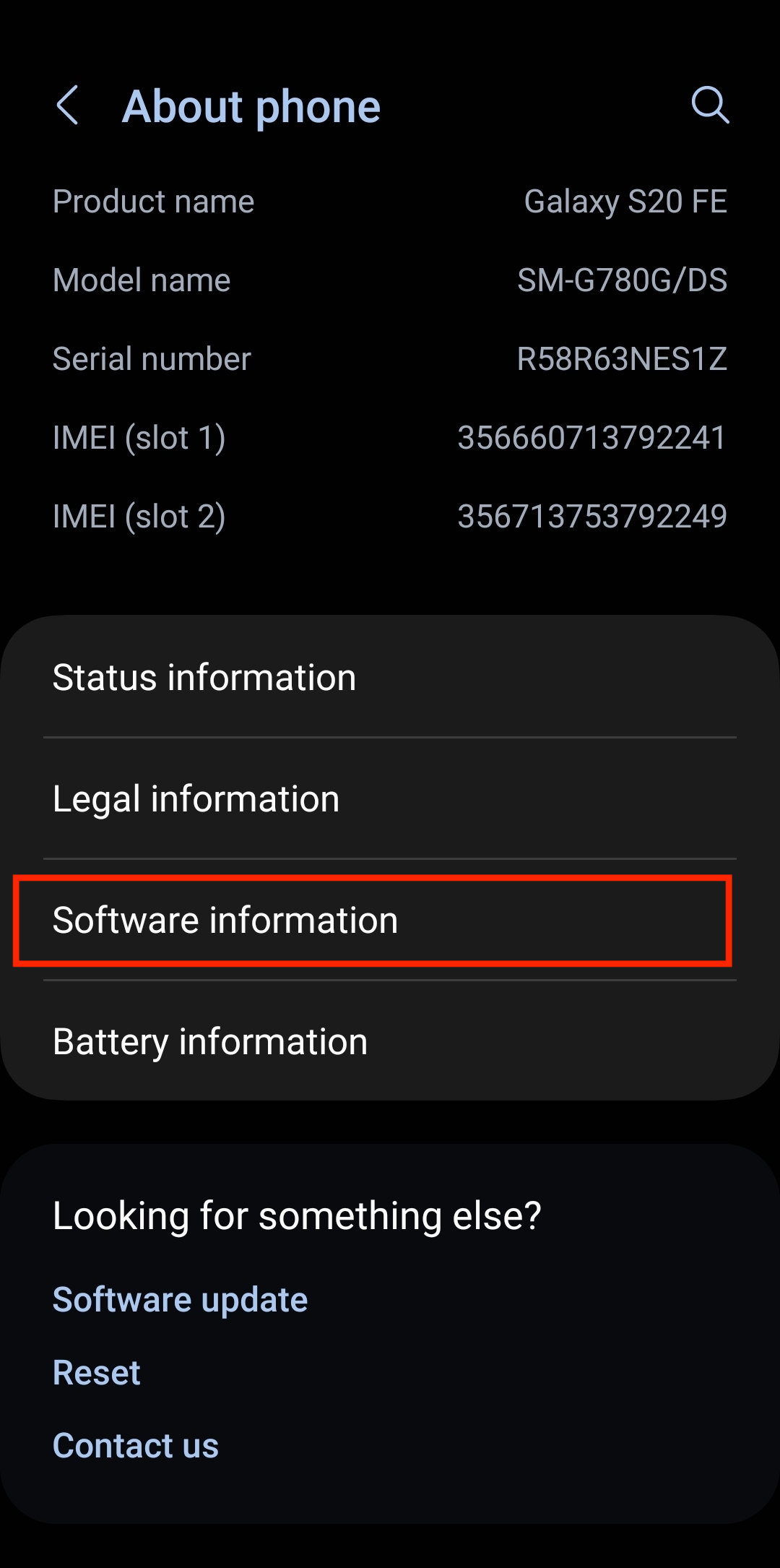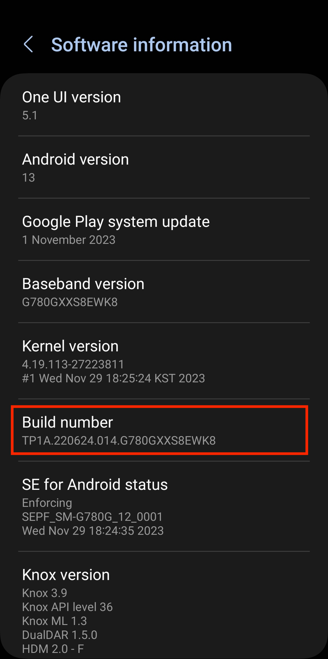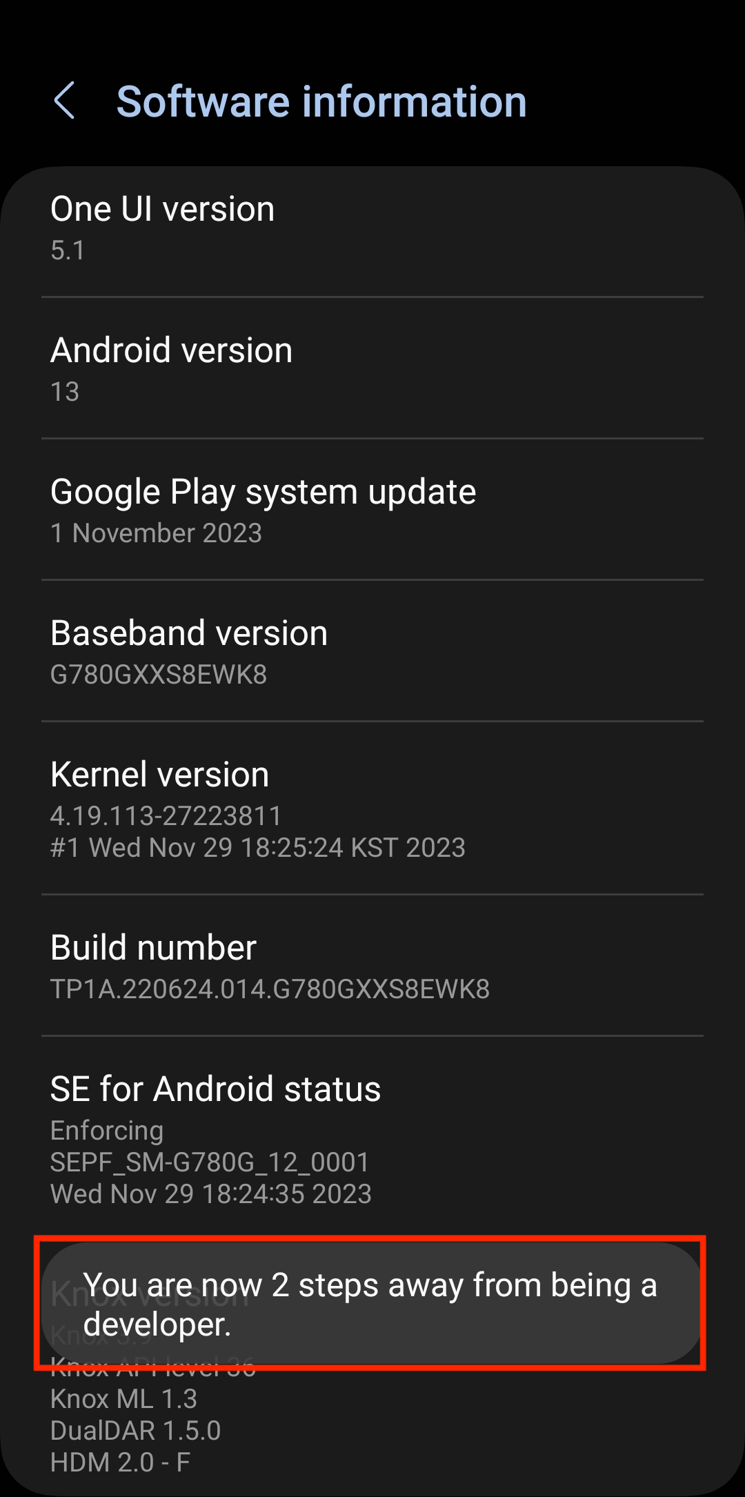 2. Locate the phone's build number and tap on it multiple times until you see a message regarding developer options and how many times you have to tap to enable it. On Samsung devices, you need to tap on Software information.