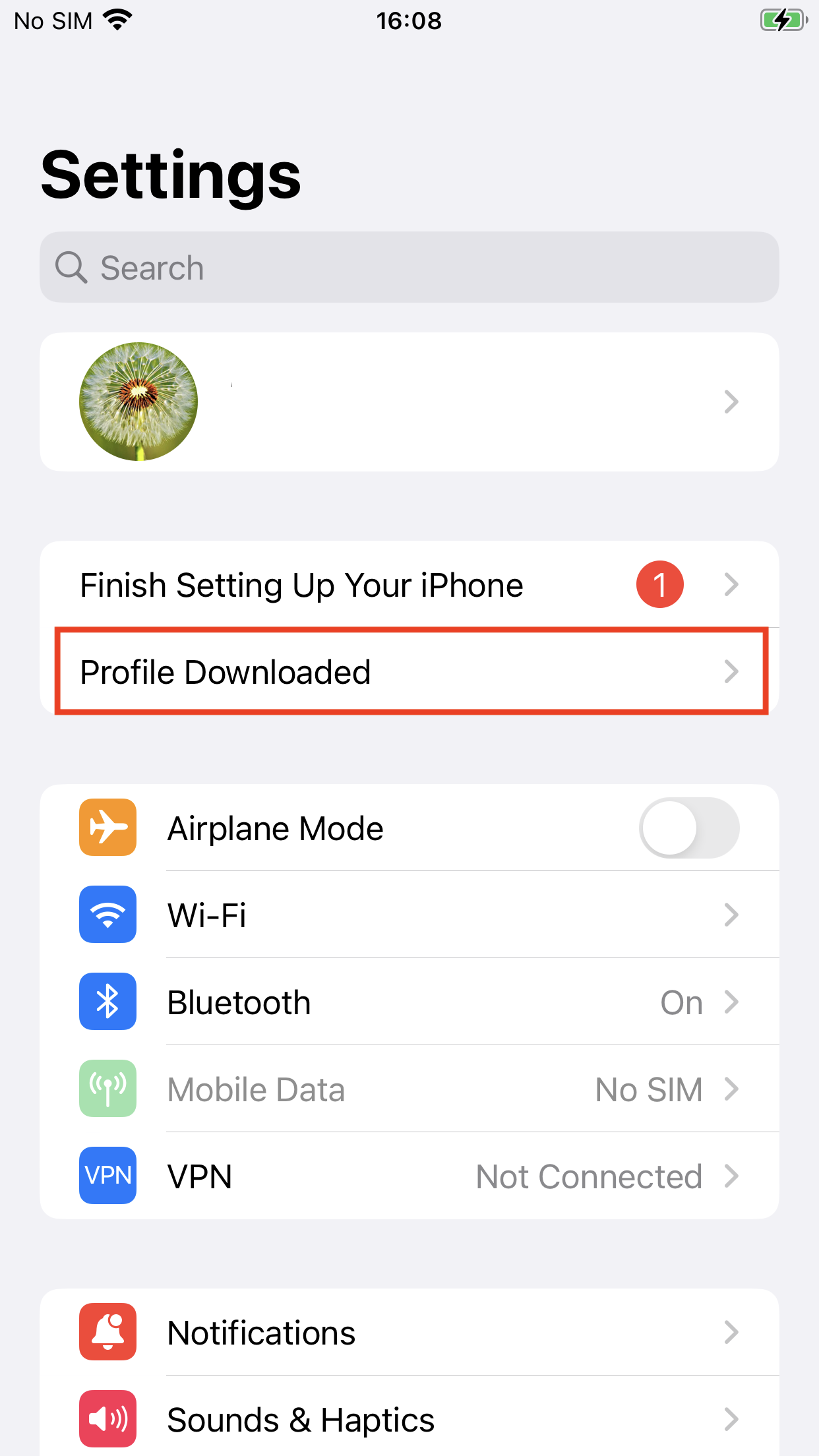 4. Open the Settings app. You will notice a tab saying Profile Downloaded. Tap on it.
