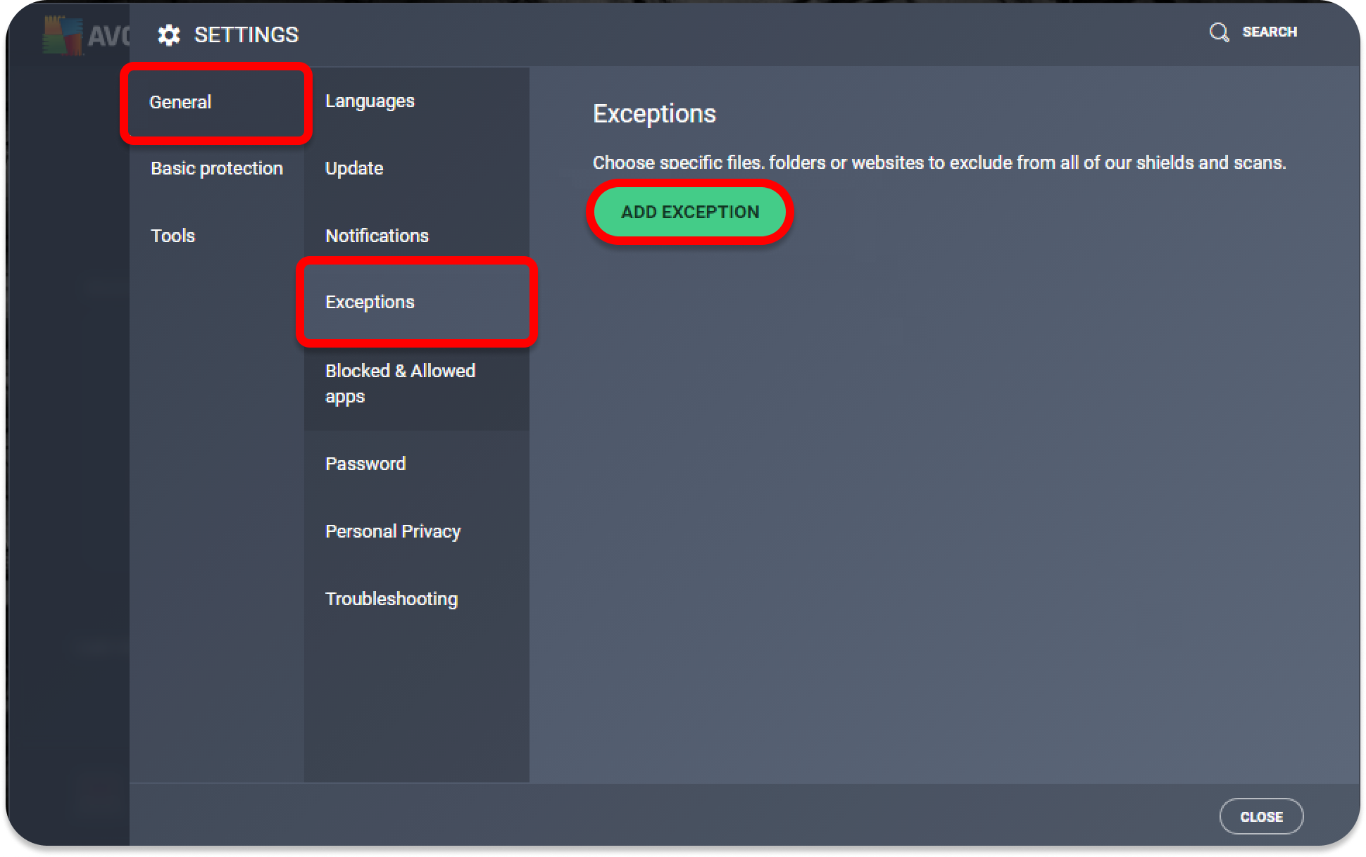 To make an exception for Surfshark in the AVG Antivirus settings, follow these steps: