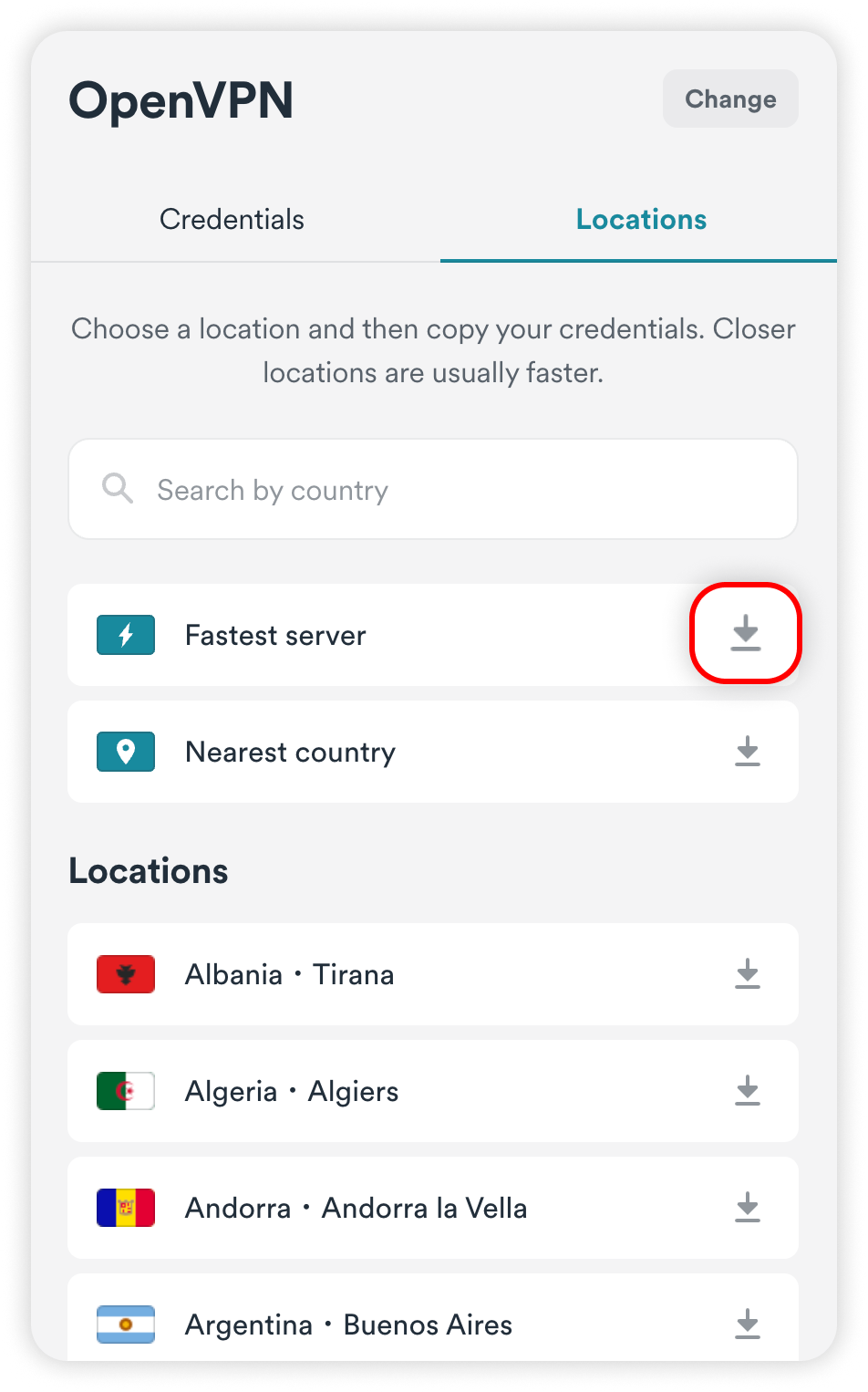 Click on the download icon to the right of the server name.