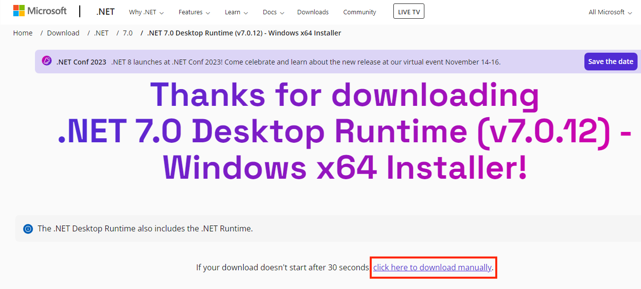 2. If the installation does not begin automatically, click on the manual download button on the same page.