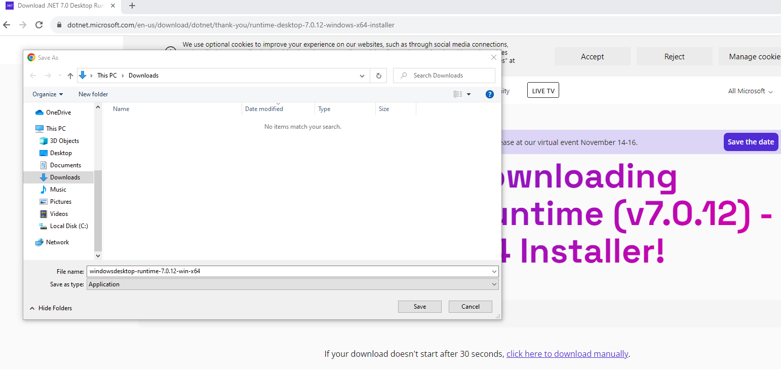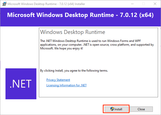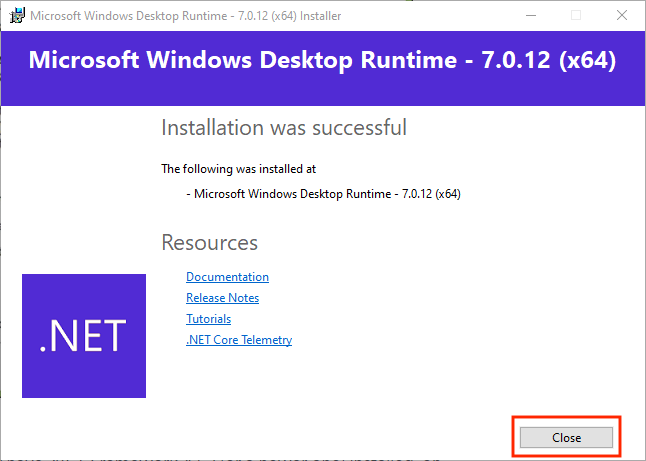 If you already have .NET Core 7.0 (or a newer one) installed, an error will appear that stops the process. You don't need to proceed further, so press Close.
