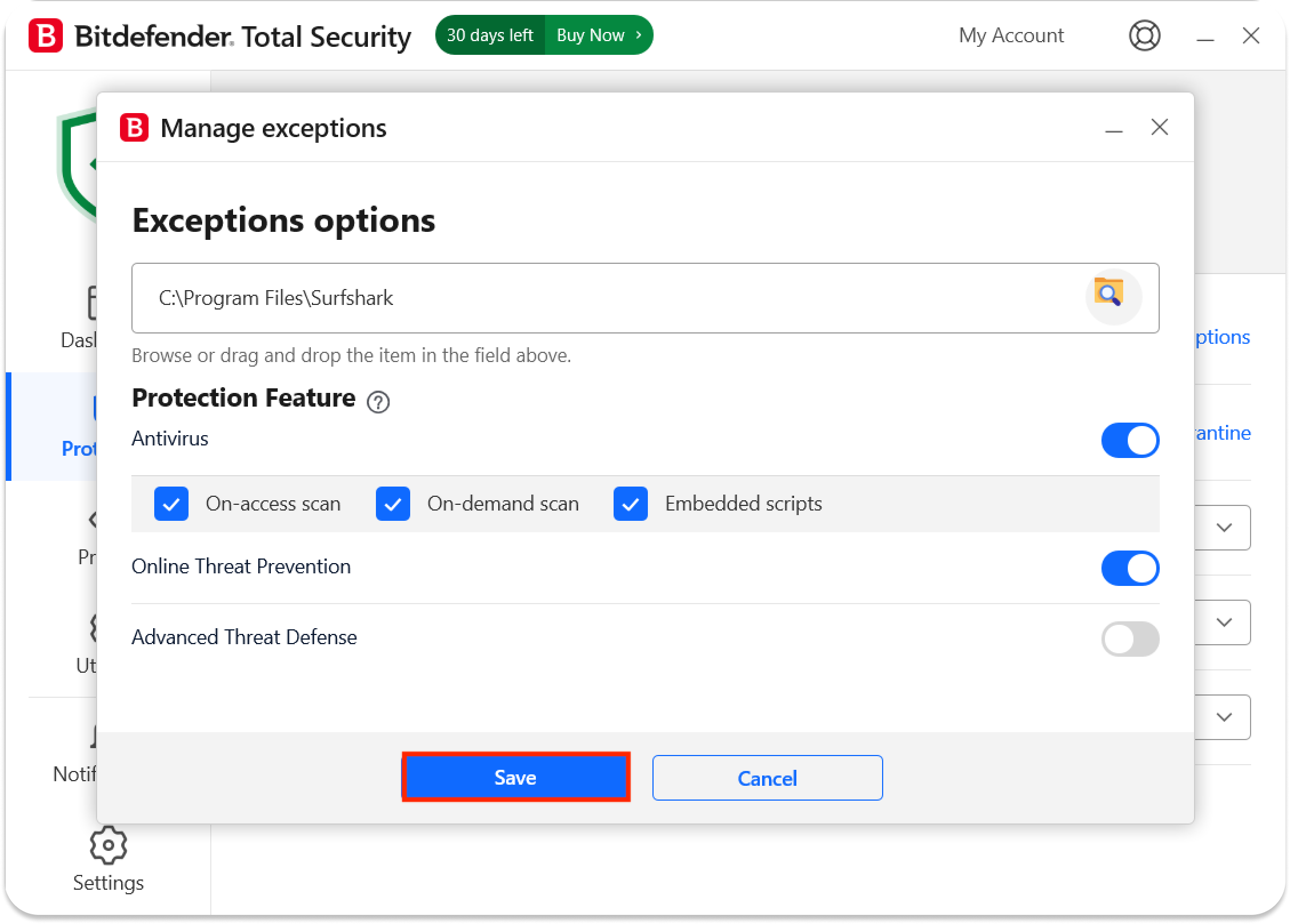 How to make an exception for Surfshark in BitDefender antivirus on Windows