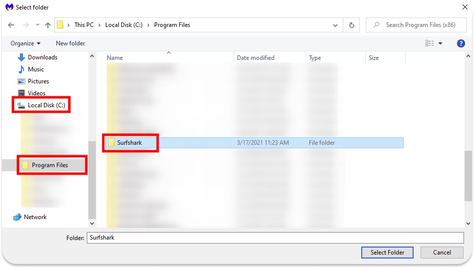 Navigate to the Surfshark folder. The default location for Surfshark is This PC > Windows (C:) > Program Files. Once you have the Surfshark folder highlighted, hit Select Folder.