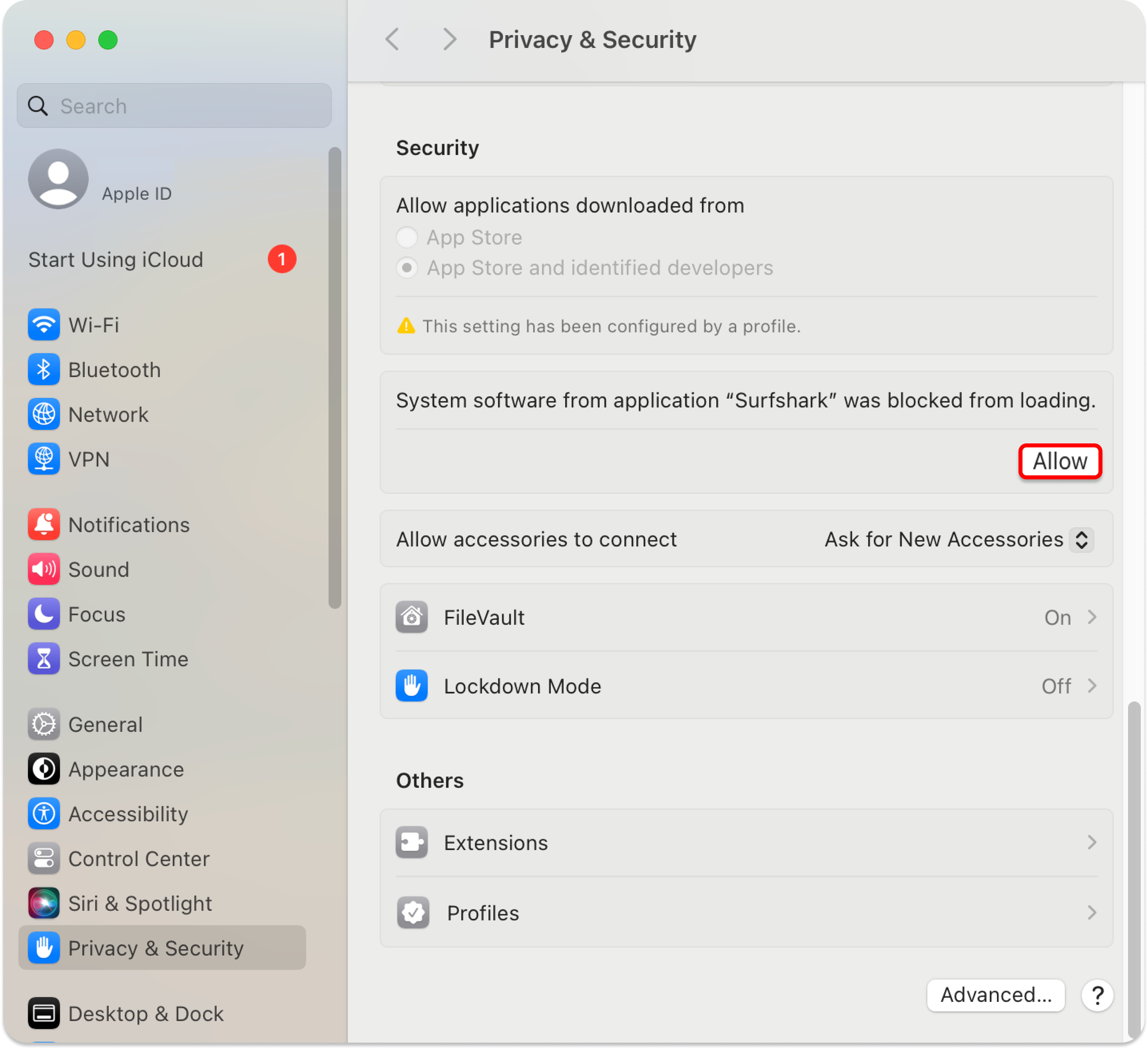 When prompted, approve adding Surfshark to your VPN configurations by clicking Allow: