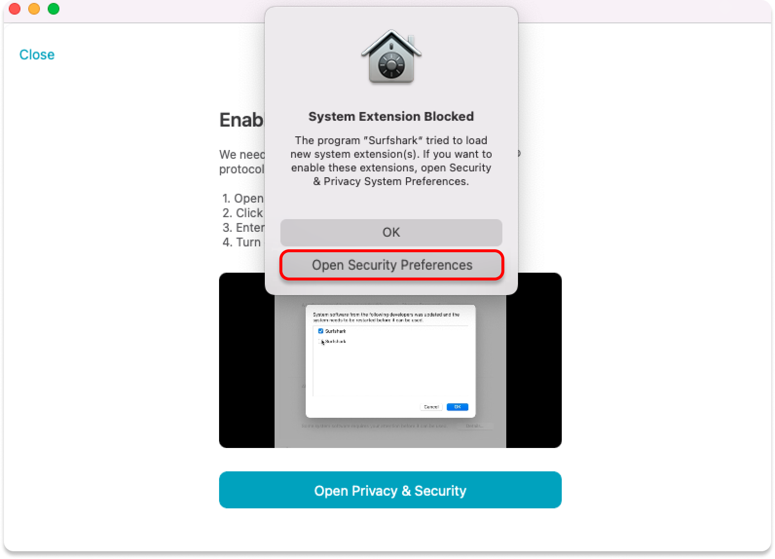 When you attempt to connect for the first time, a system pop‑up will appear. Click Open Security Preferences: