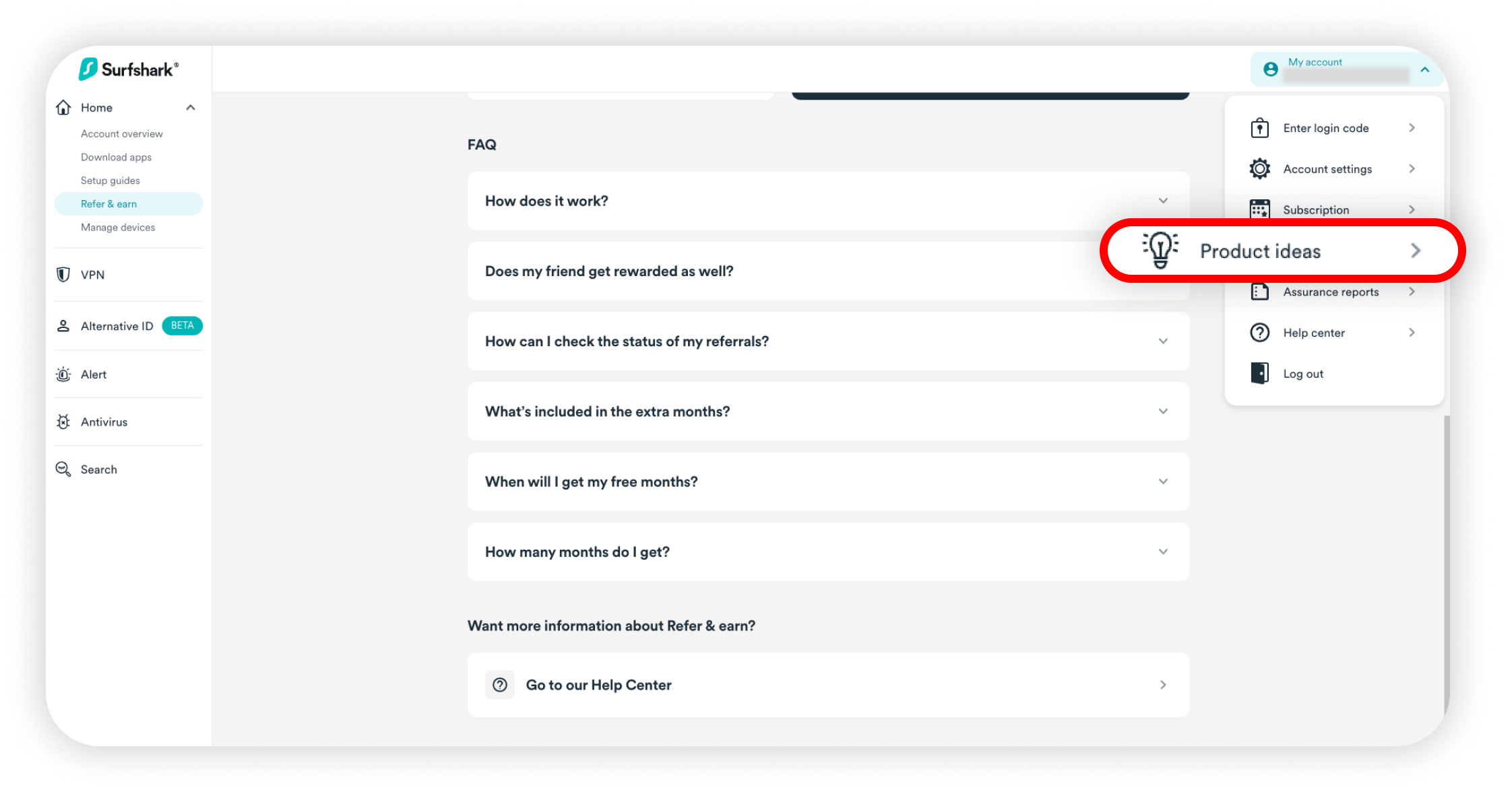 1. Open your Surfshark account in a browser, press the icon in the top right corner of the screen, and select Product Ideas.