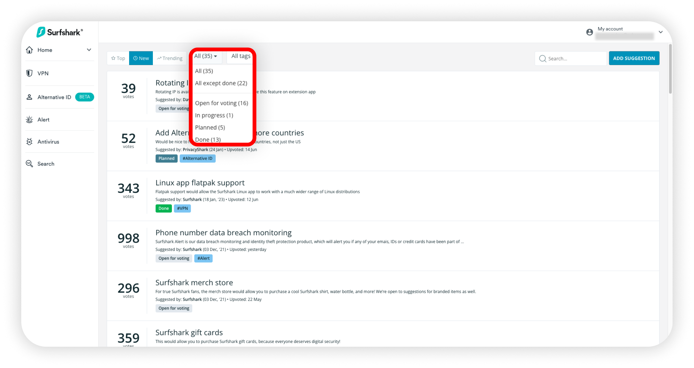 Clicking the All button next to the Trending button will reveal a selection box, where you can specify whether you want to see what ideas Surfshark has already implemented, plans to implement, is currently in progress, or is still being voted on.