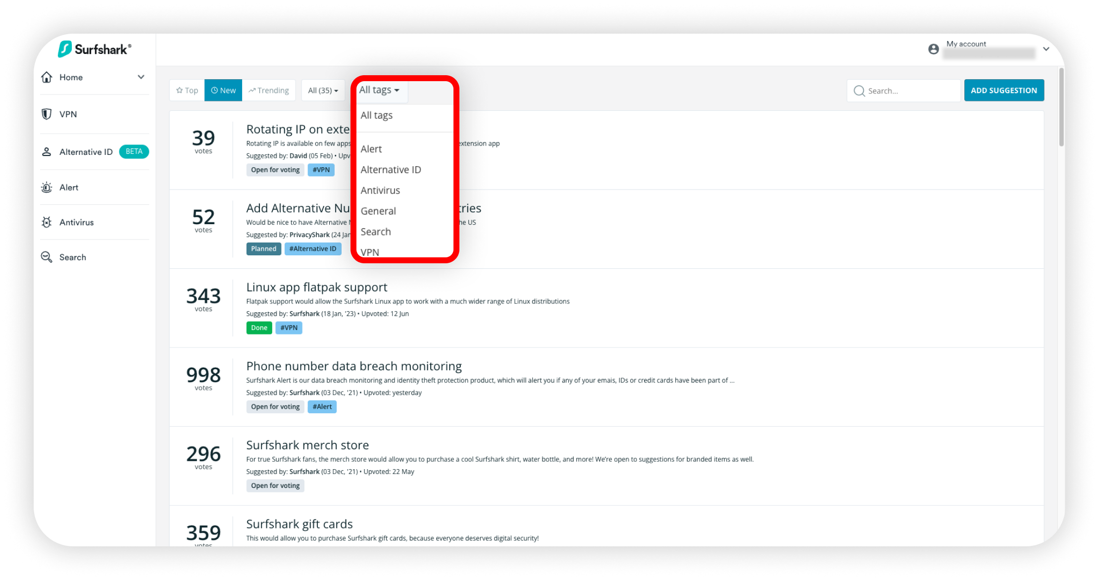 Selecting the tags button will allow you to filter the results by a specific tag. For example, selecting the VPN tag will only show suggestions for the Surfshark VPN, but choosing Antivirus will show suggestions tailored only to the Surfshark Antivirus.