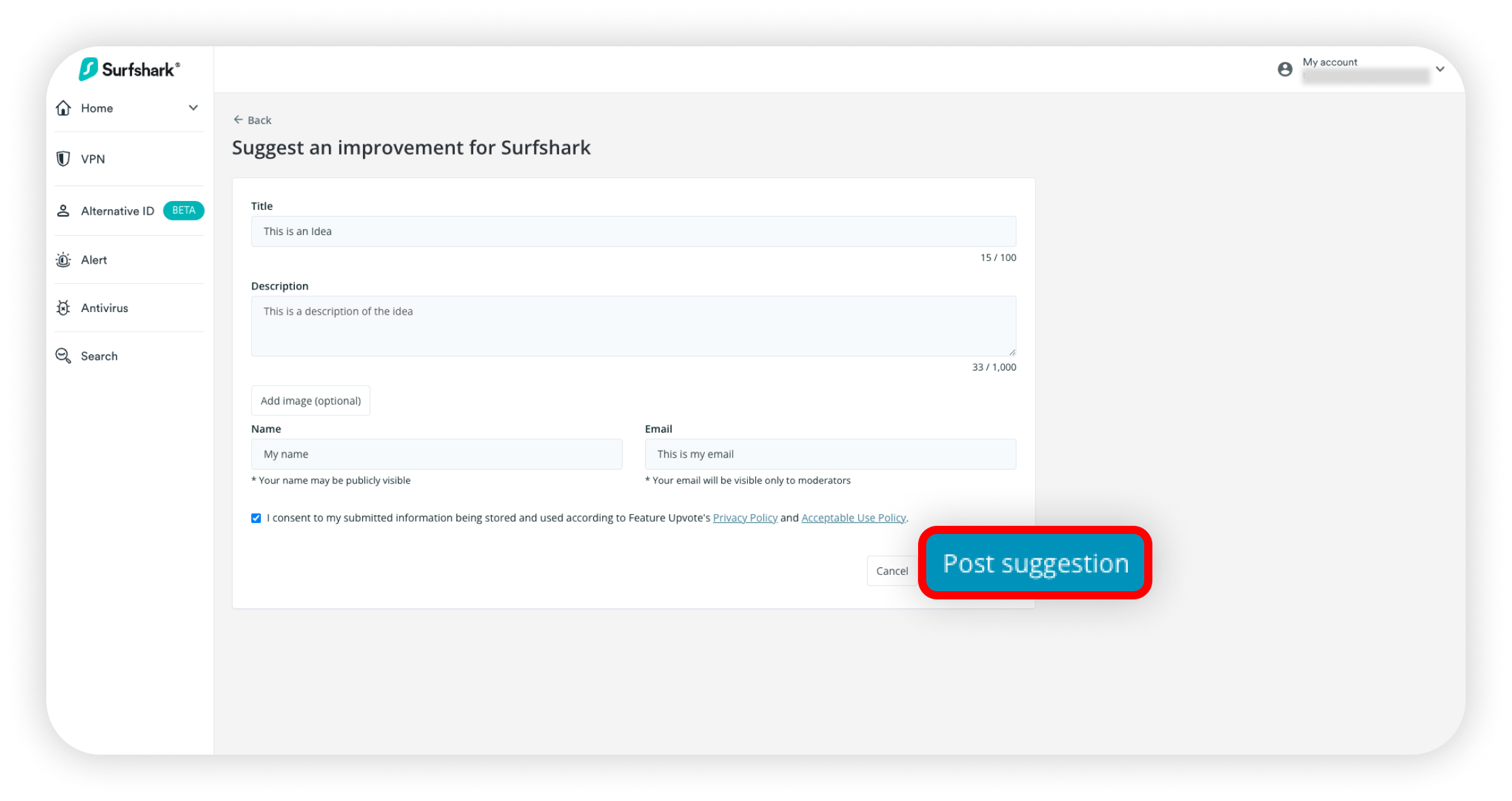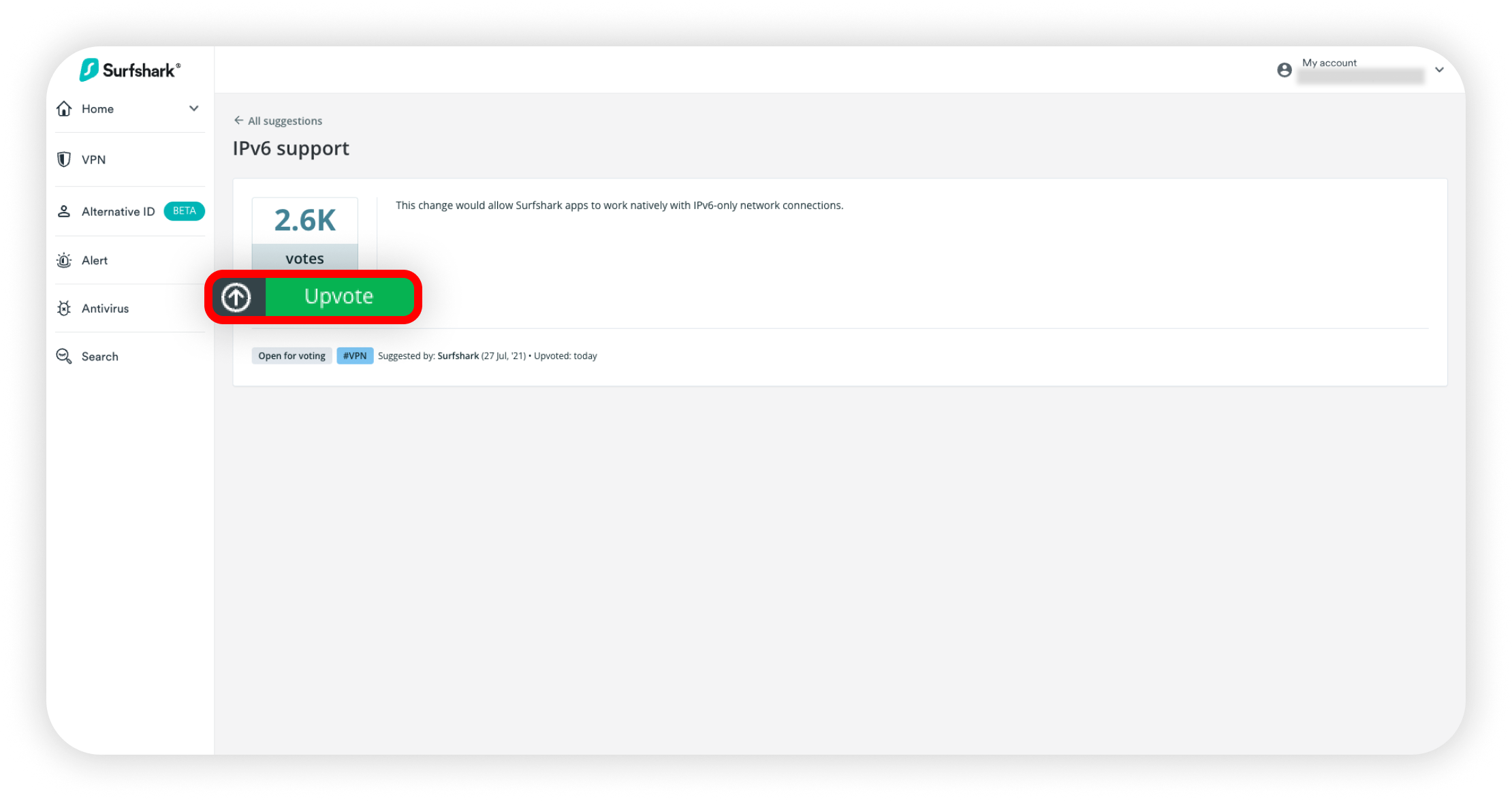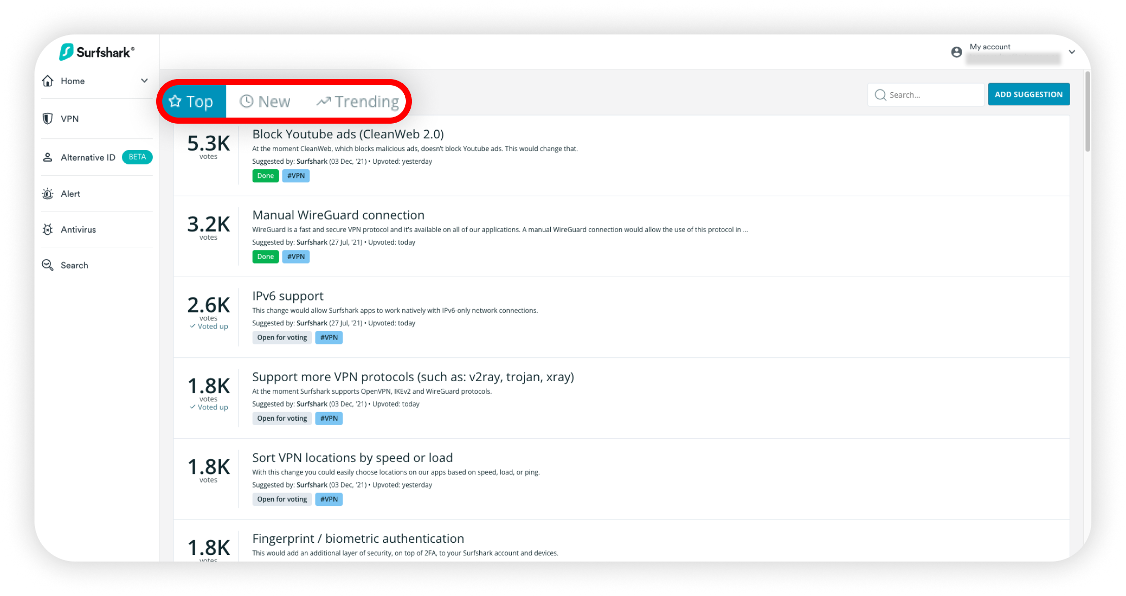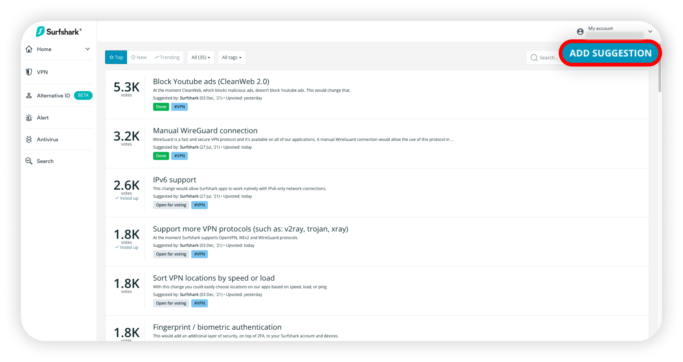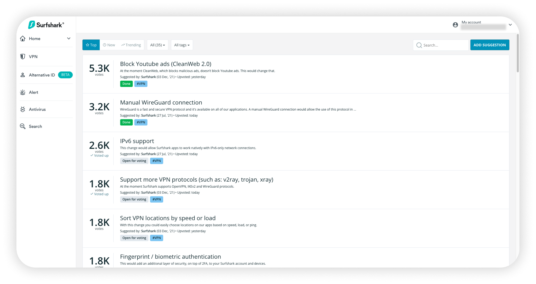 Your feedback is important to us and allows us to develop better and stronger features. As a result, to make this process smoother and faster, we have the Surfshark Product Ideas feature. This article shows you how to use it to either vote on your favorite suggestions for new functionalities and improvements or to submit a brand-new idea yourself. It's your chance to help steer the future of Surfshark and ensure we're building the best possible tools for your online privacy and security.