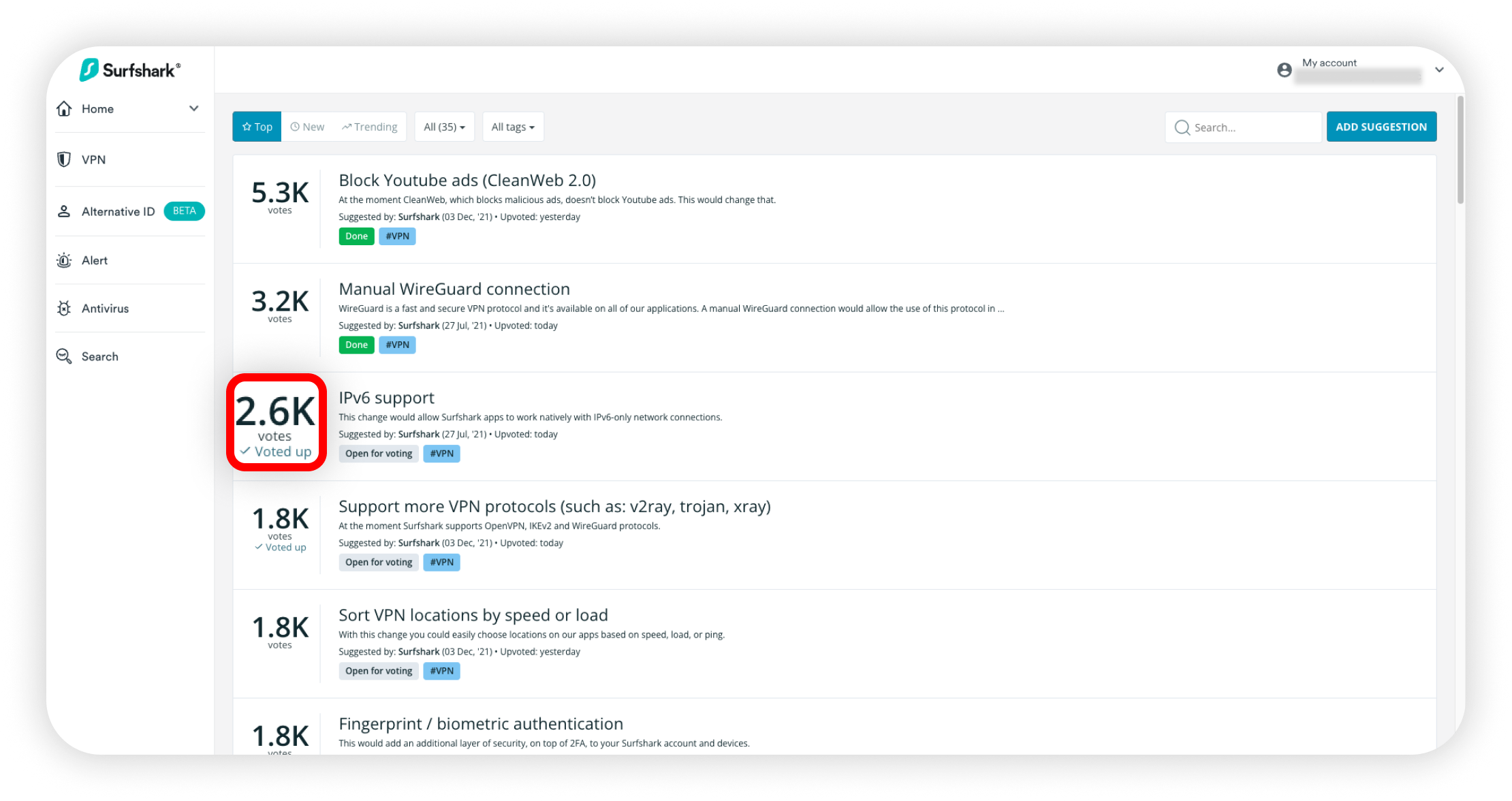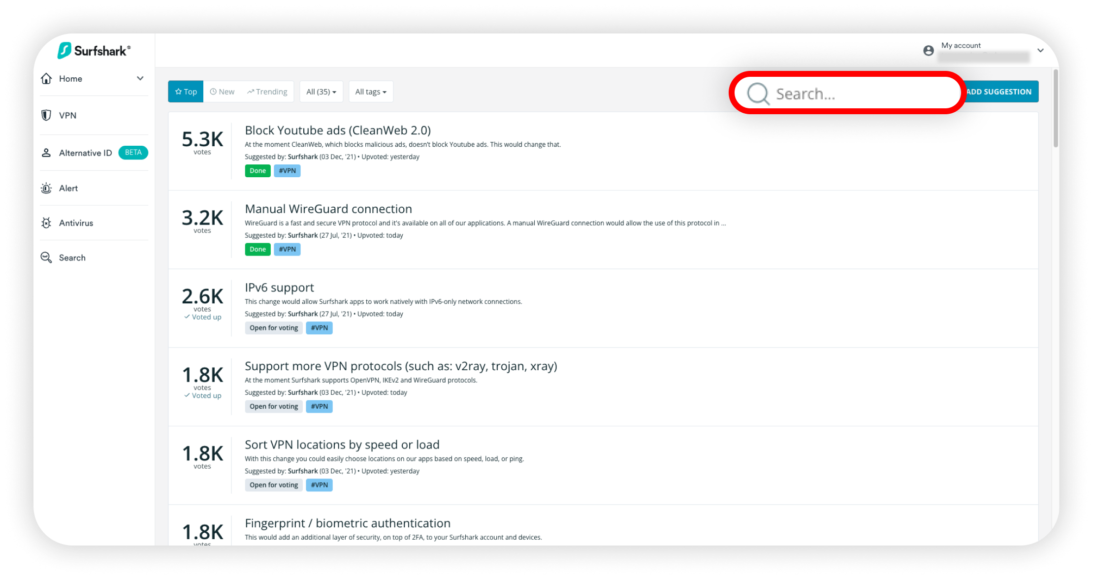 If you find an idea you want to support, click on the title. The Surfshark web page will now take you to the suggestions page.