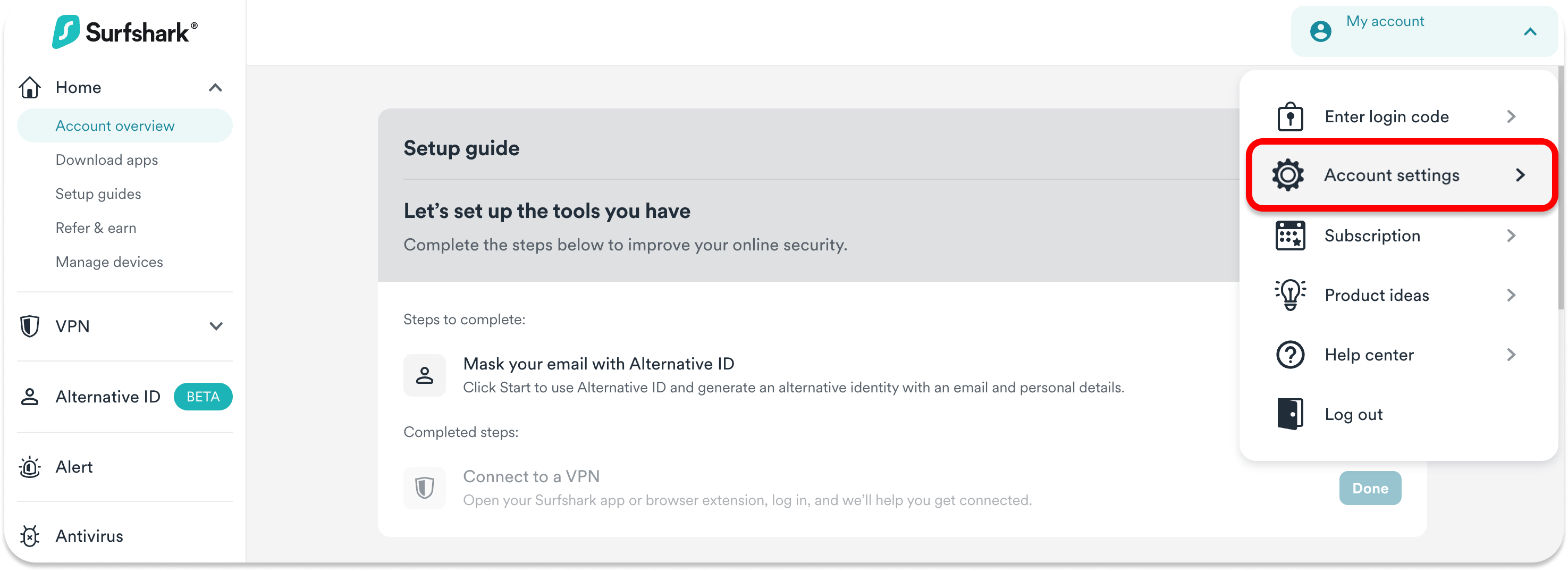 1. Log into your Surfshark account, click on My account at the top-right corner, and select Account settings.