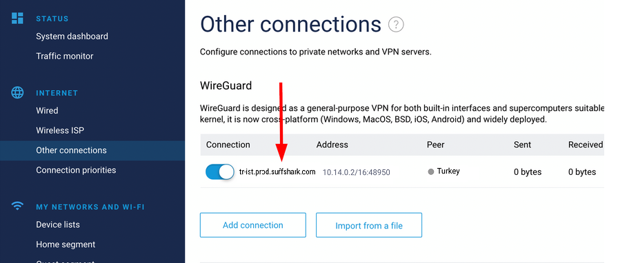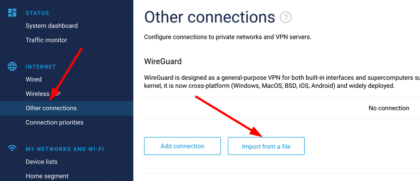 Once rebooted, open up the router interface again and select the Other connections menu. Click the Import from a file button (refer to Choose a Surfshark server section in this article).