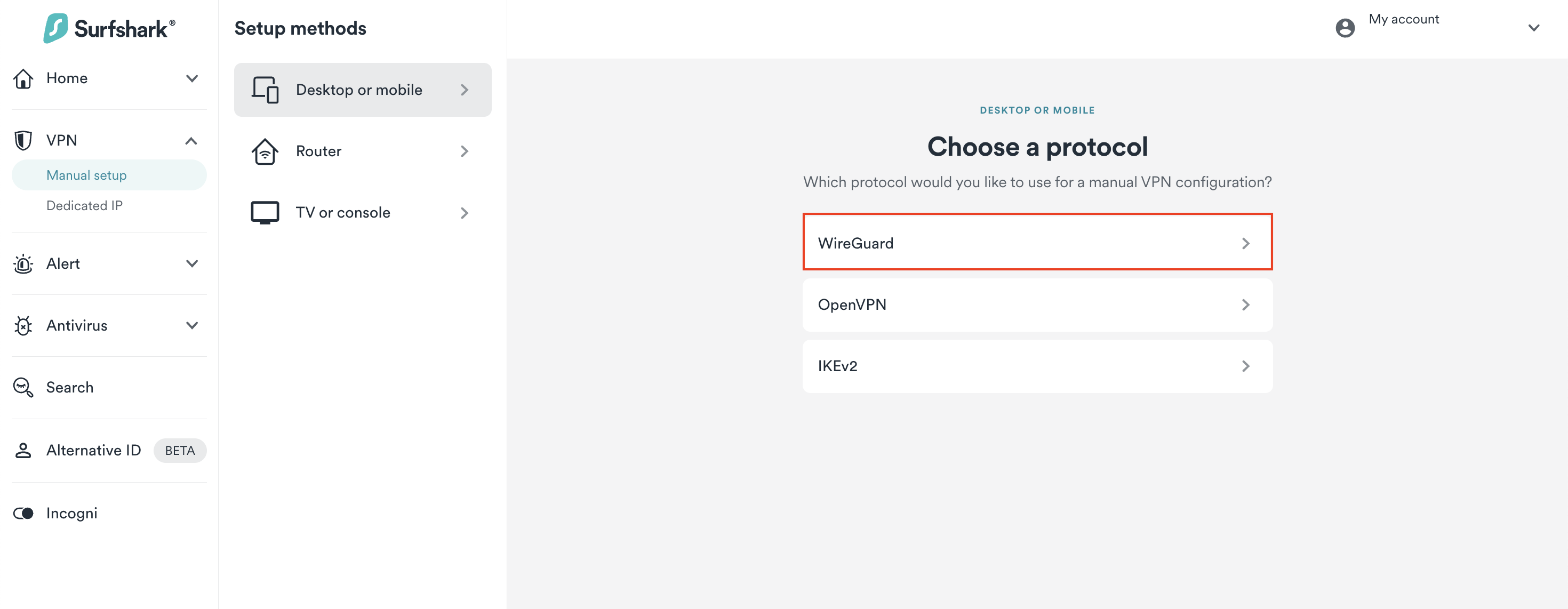 - Go to Surfshark's login page and log in. Then, visit VPN > Manual setup. Choose the Desktop or mobile option and click on WireGuard.