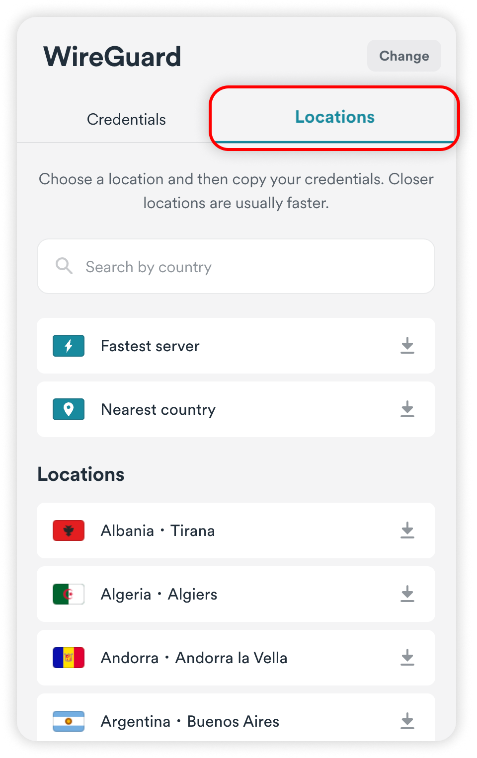 1. Head to the Locations tab and locate the server that you wish to connect to.