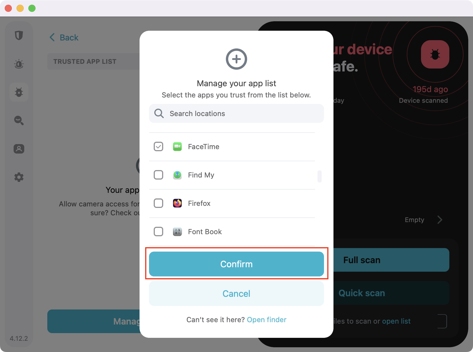 - Once you select your apps, simply hit Confirm. In our case, we added the FaceTime app to be able to use the webcam.